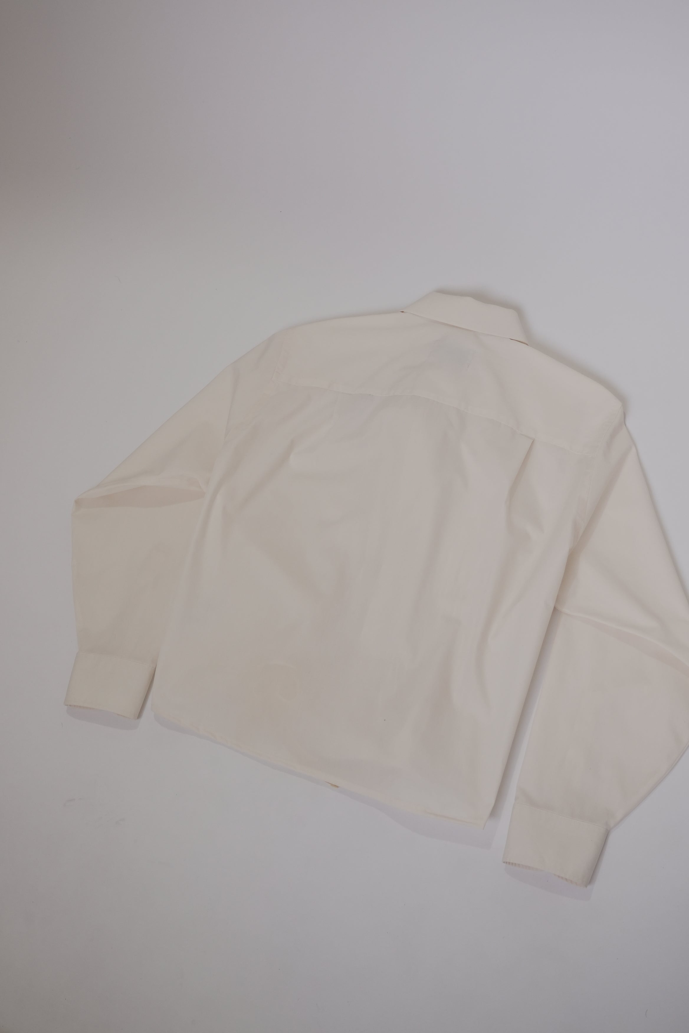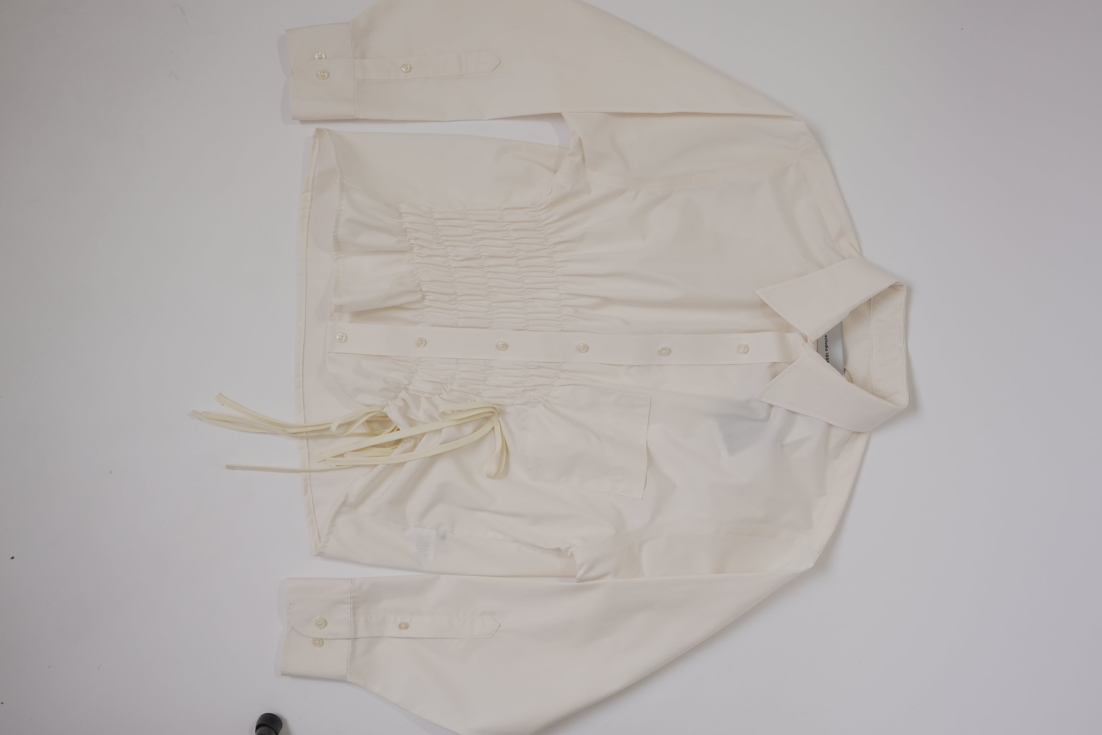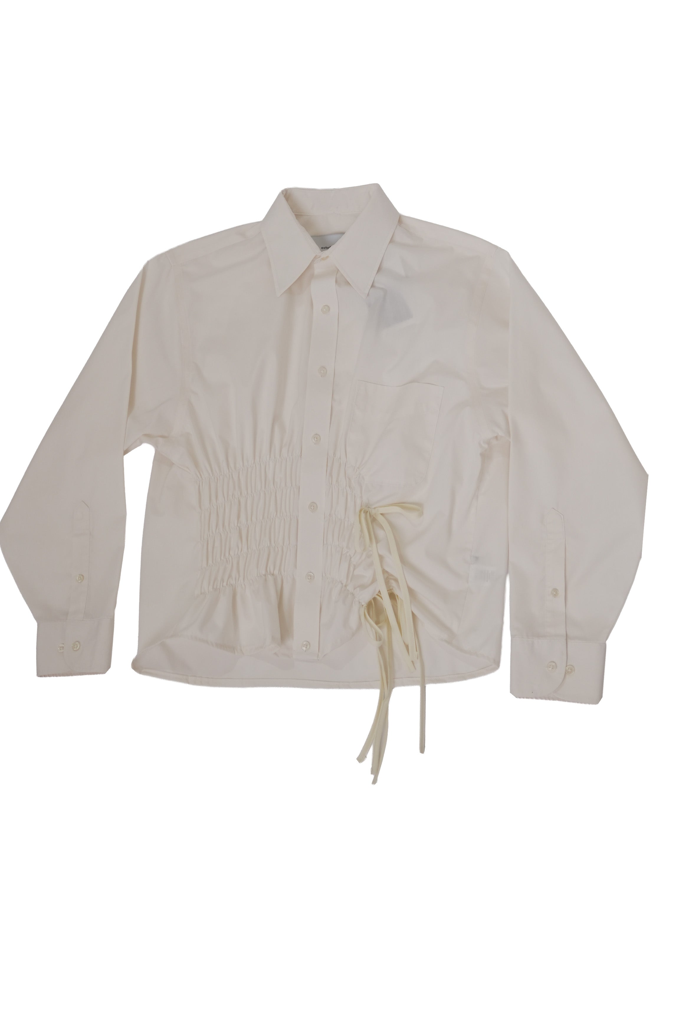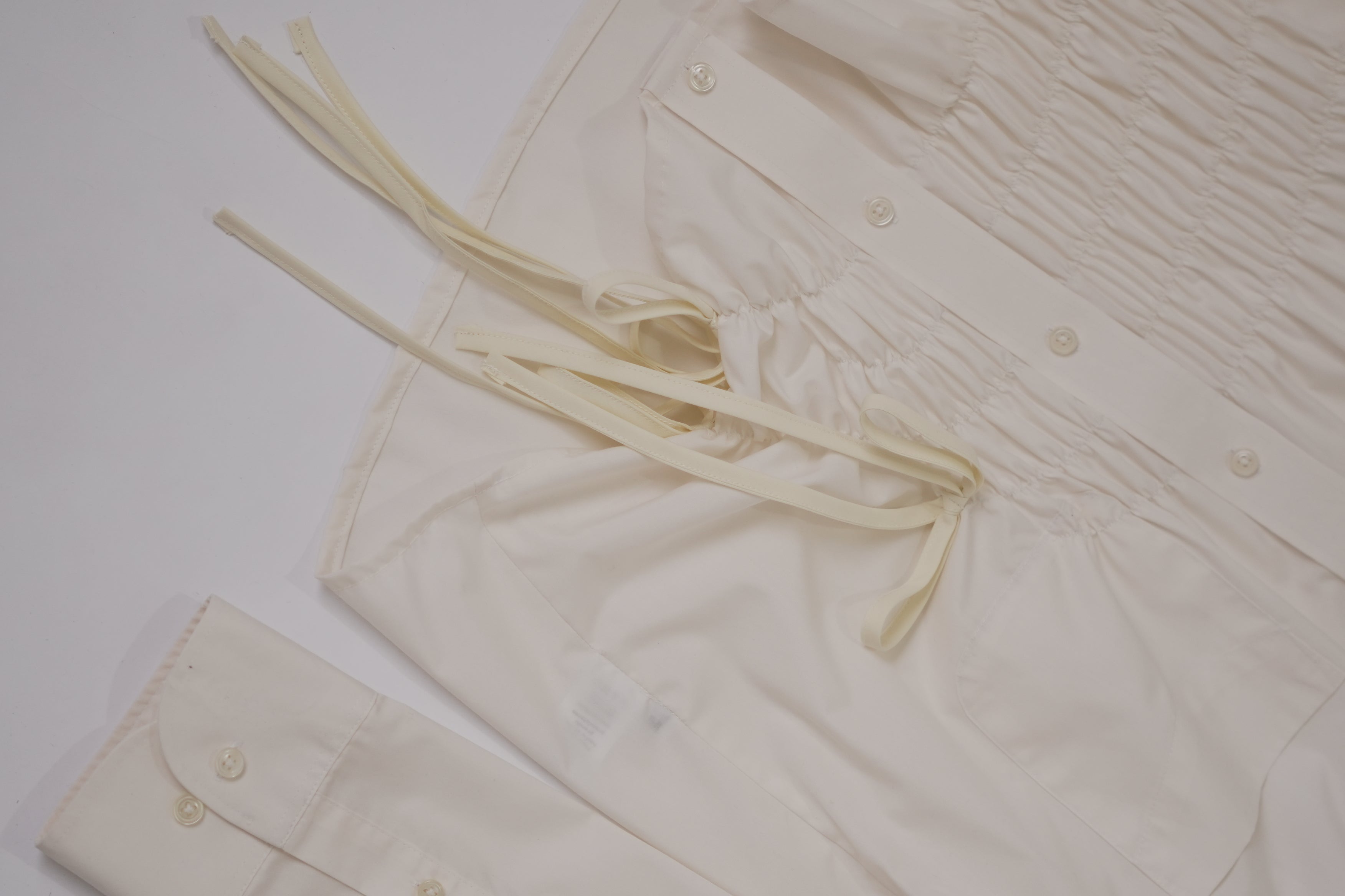 Camisa upcycled 1/1 con moños y elástico en el frente.