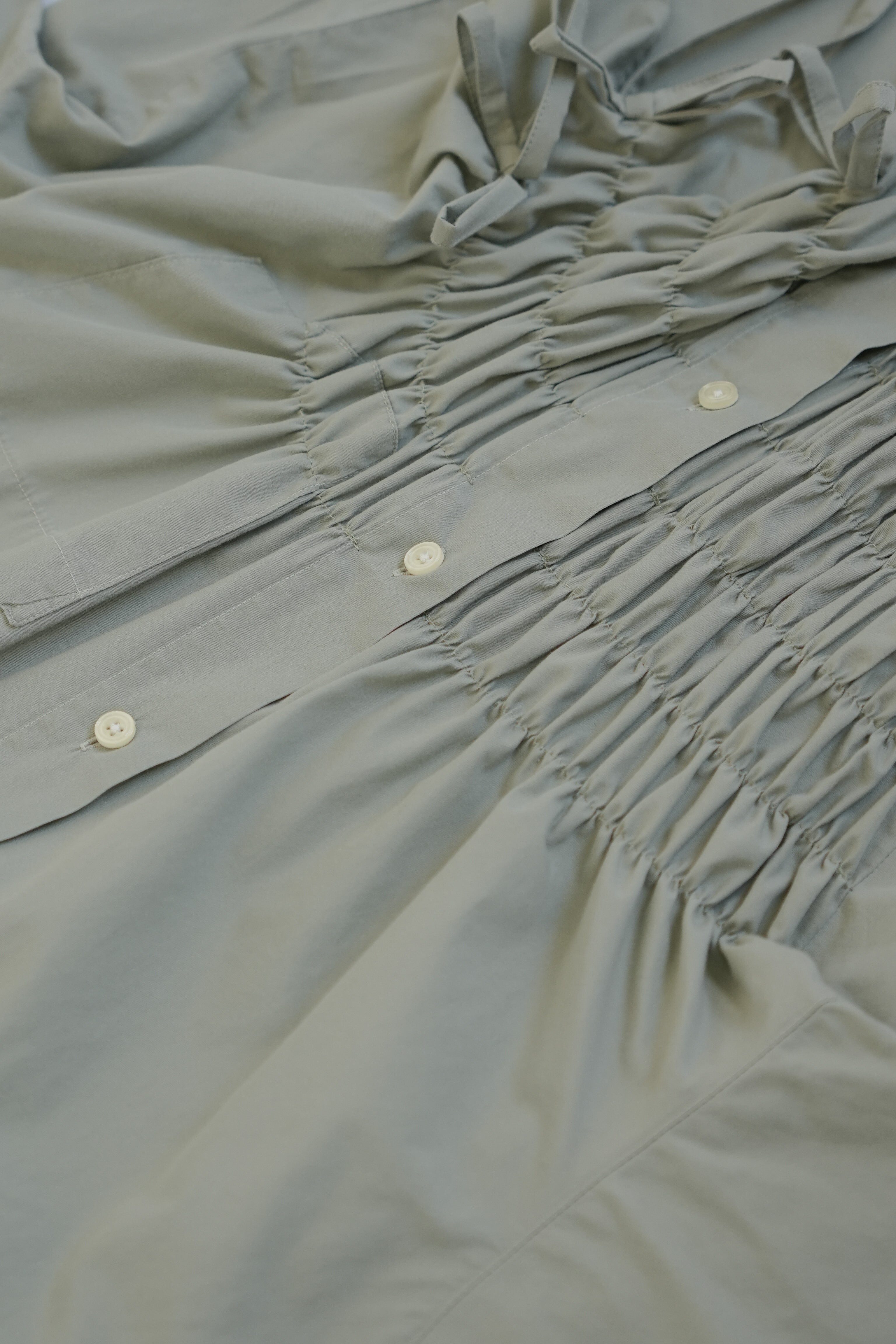 Made from cotton, its design features a cascade of gathers that define a unique silhouette. Each piece is one-of-a-kind, with its own distinct personality in its details and fabric.