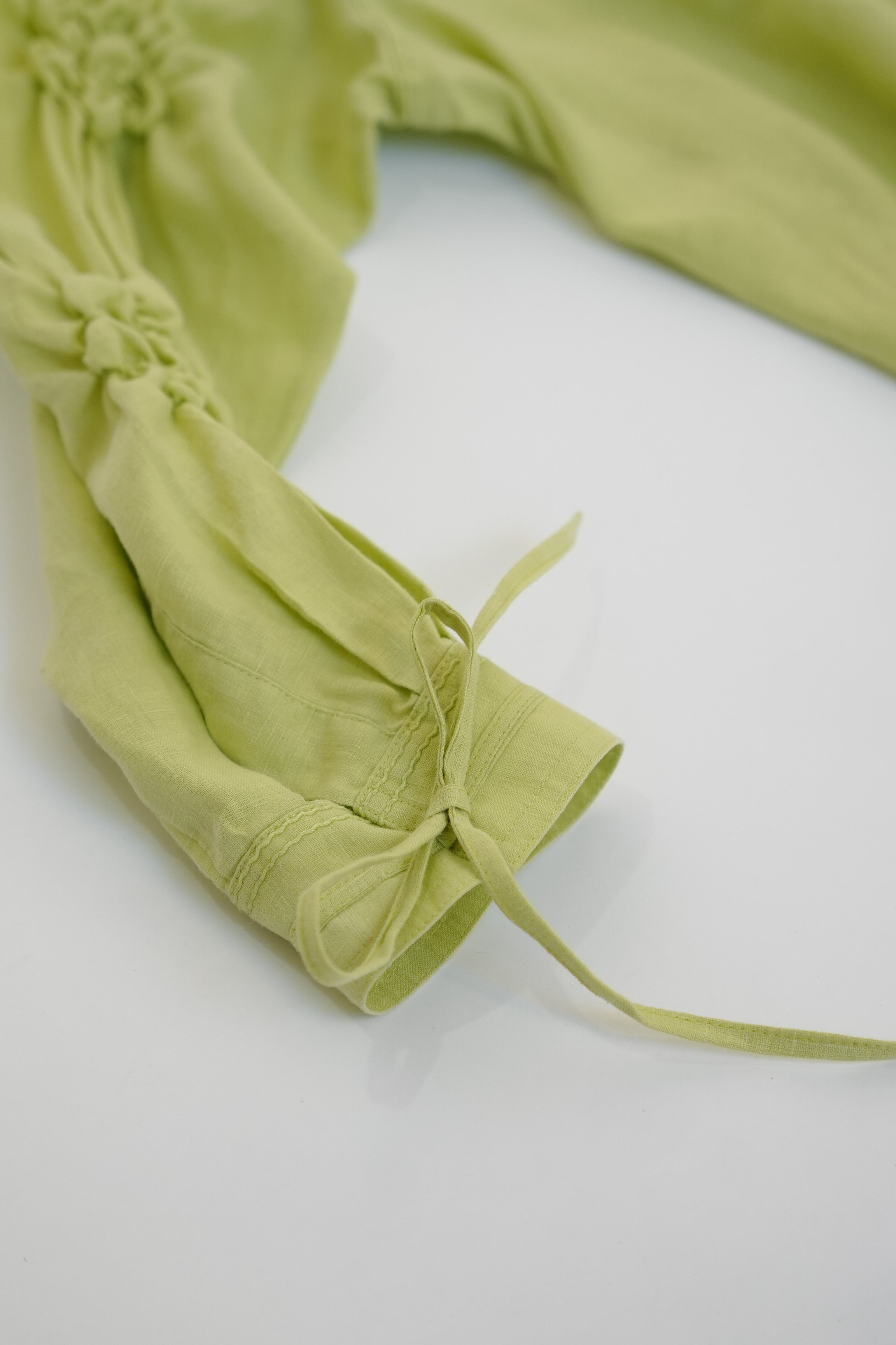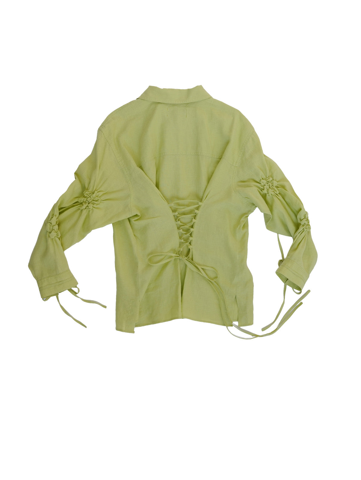 Upcycled 1/1 shirt with elastic flowers on the sleeves and adjustable straps on the back.