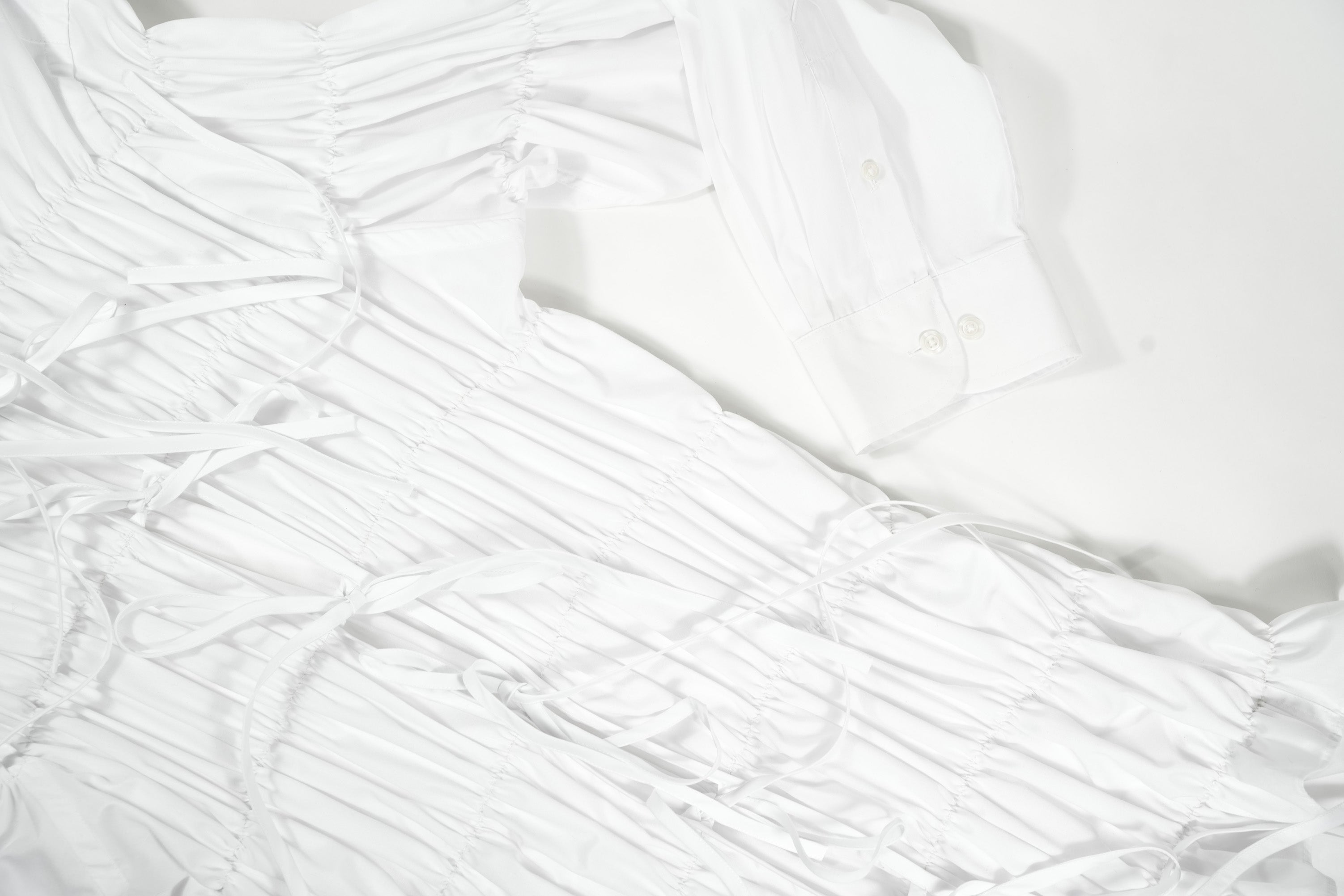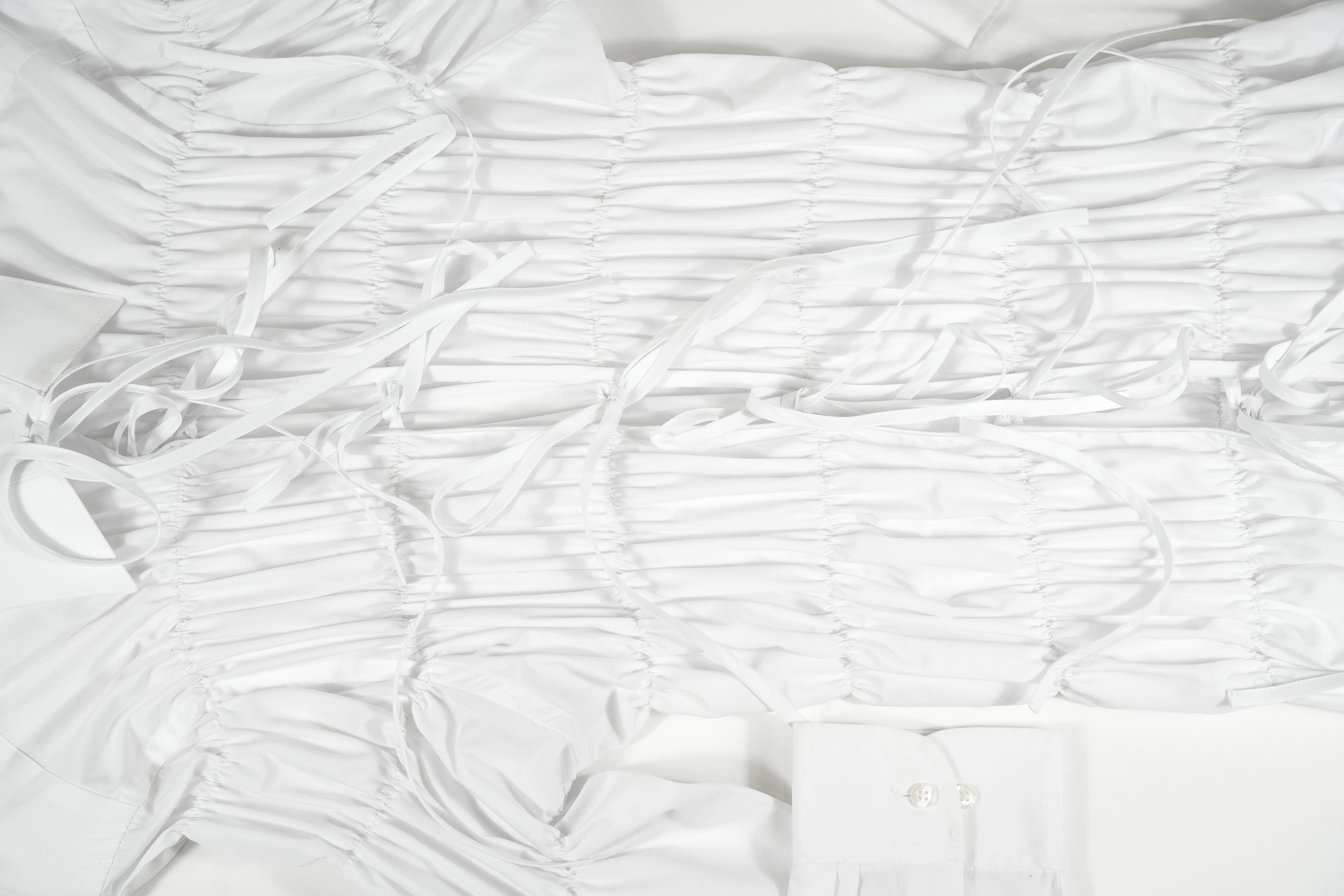 Long oversized shirt with all-over elastics inspired by the texture of foam. With ties at the collar, play with them to create different looks.
