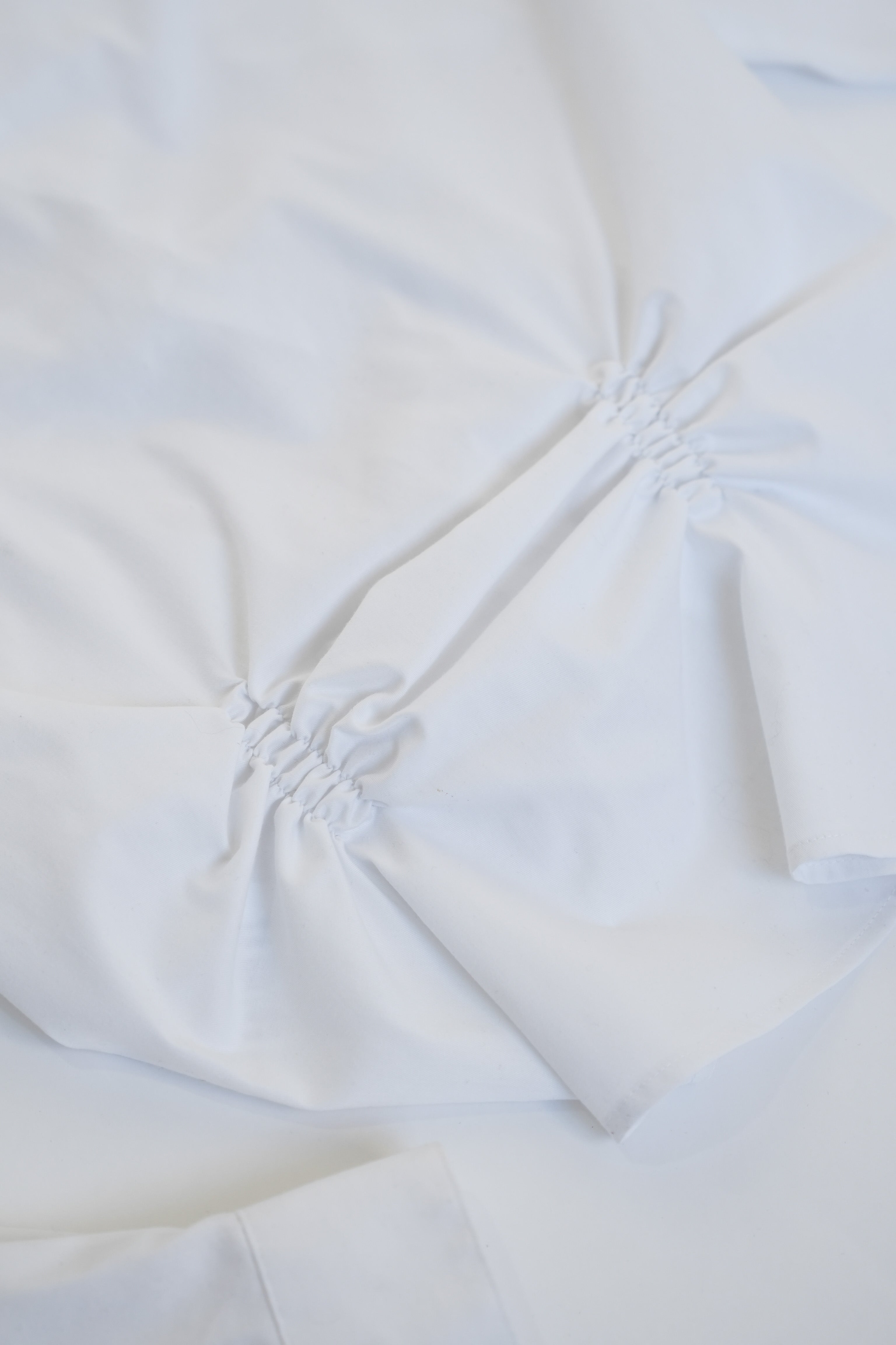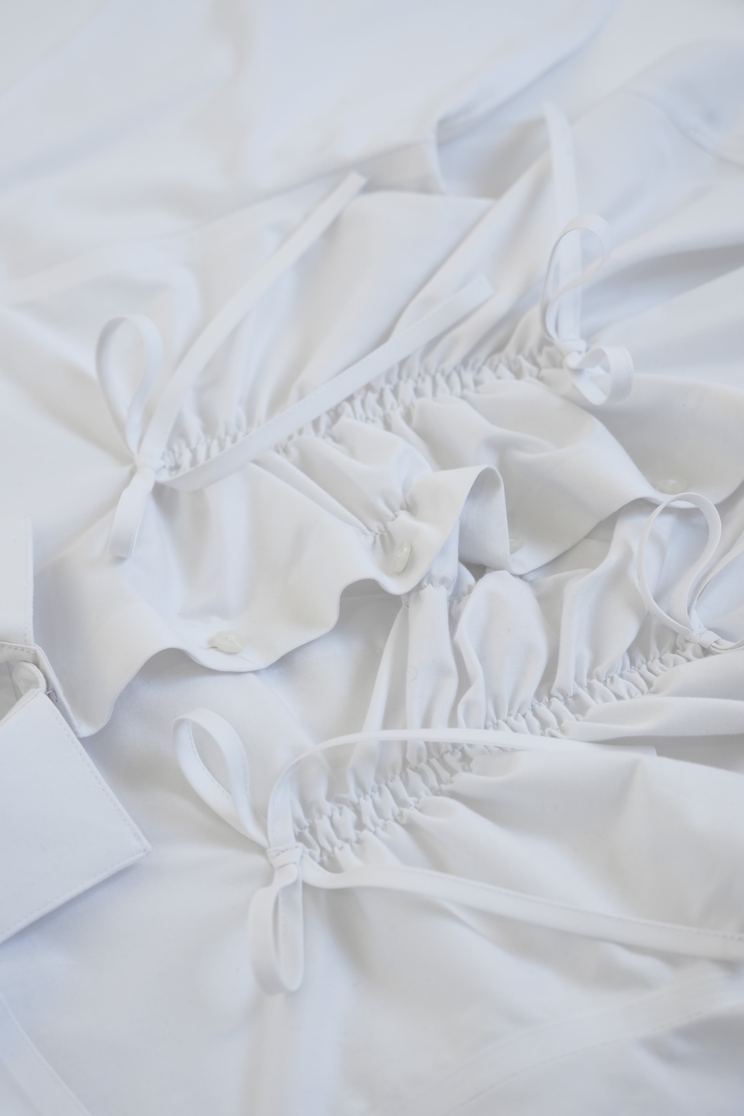 With gathers and ribbons that reinvent a classic. Each piece is unique, with its own personality in its details and fabric.