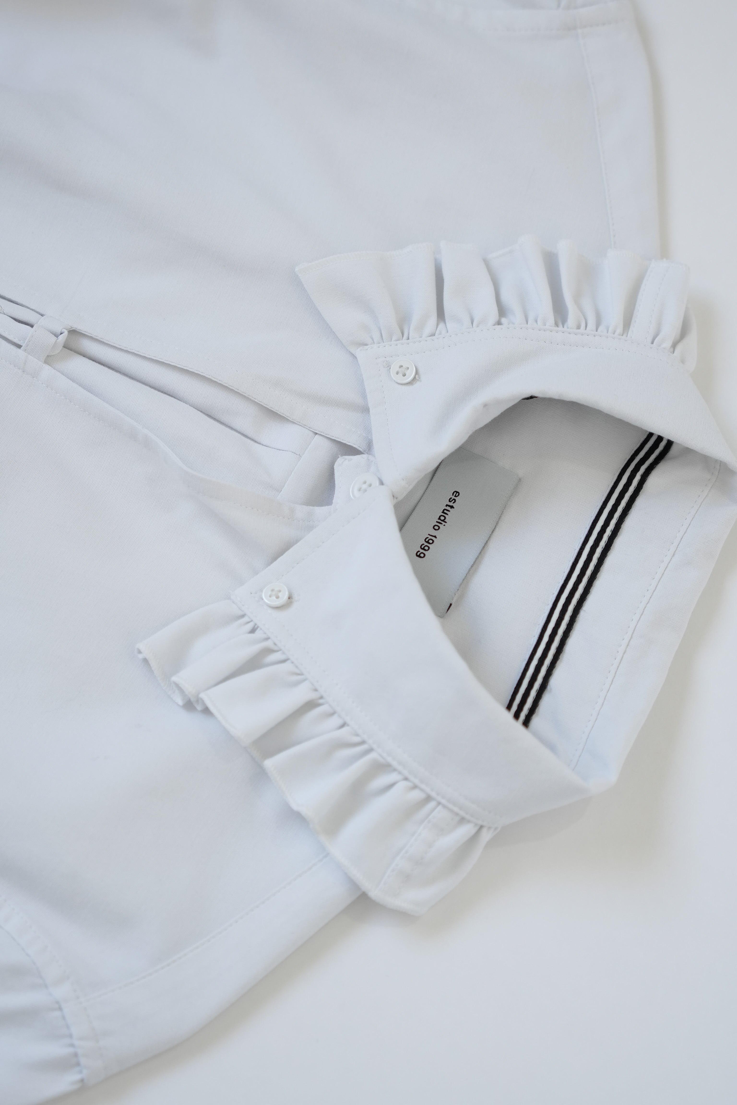 This shirt has been reimagined from a pre-existing men's shirt, adding romantic details. It features elastic at the waist for a flattering fit and delicate ribbons down the center that add a feminine and distinctive touch.