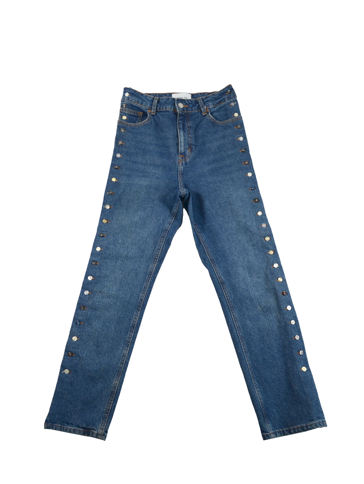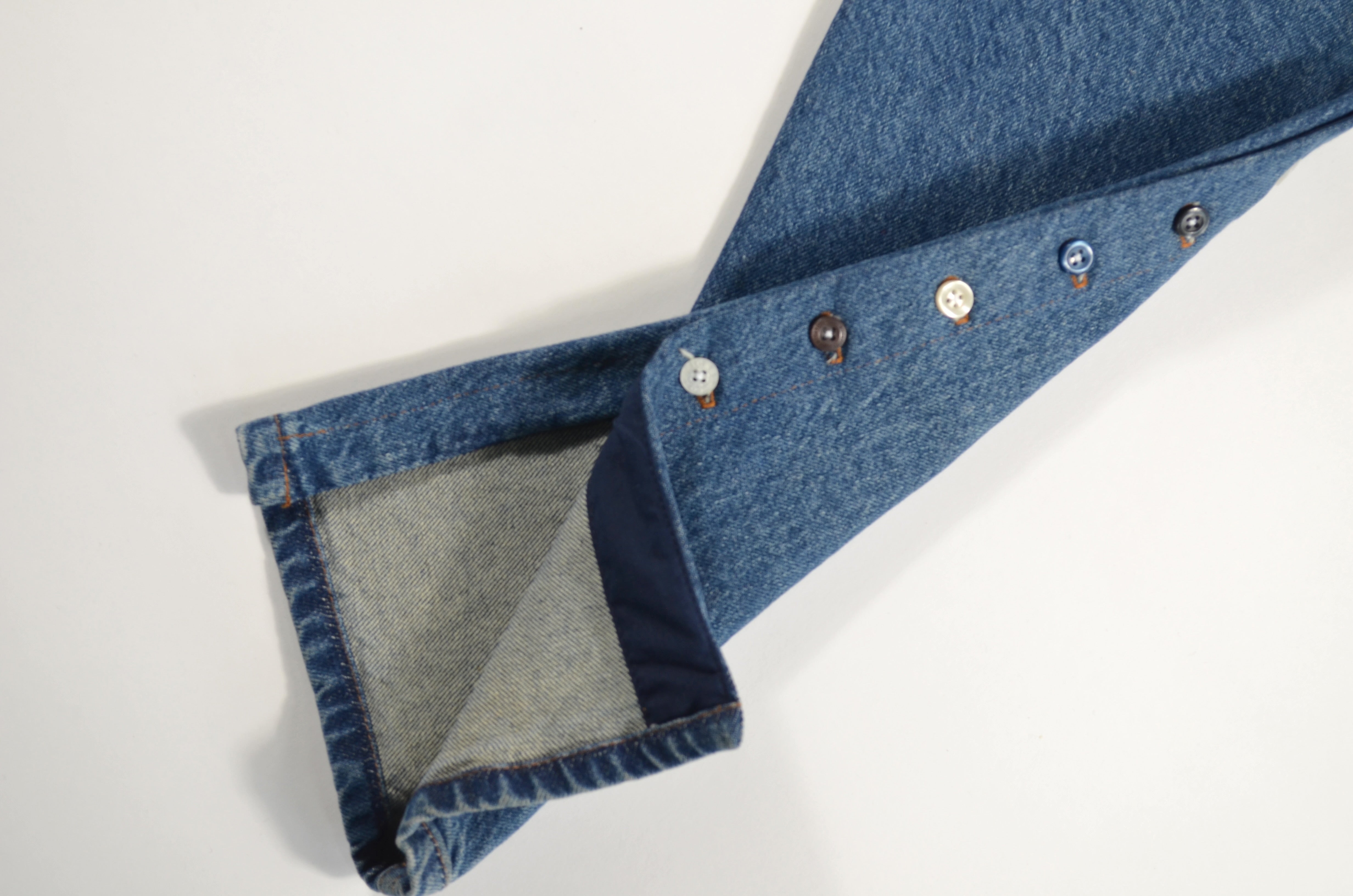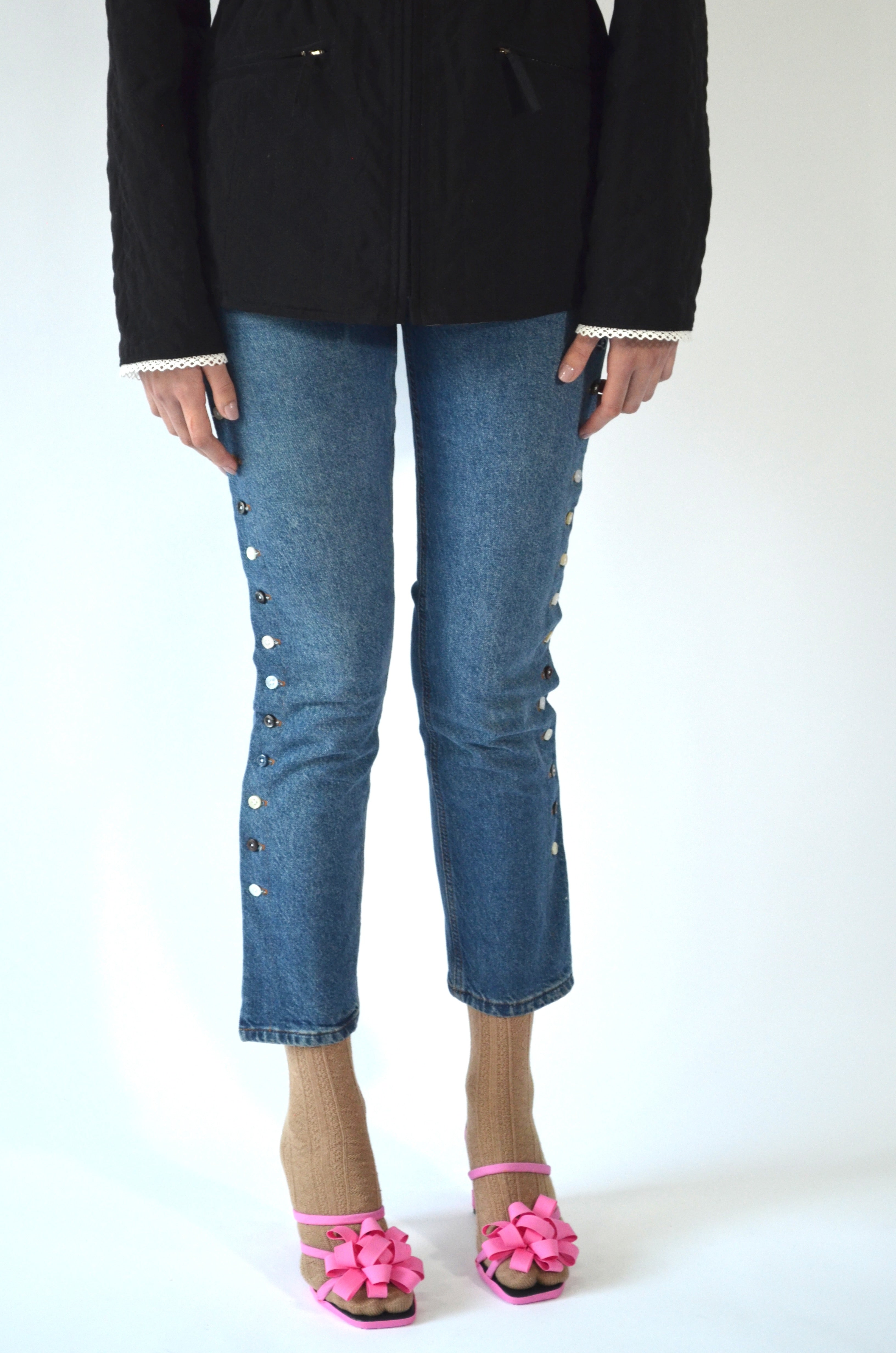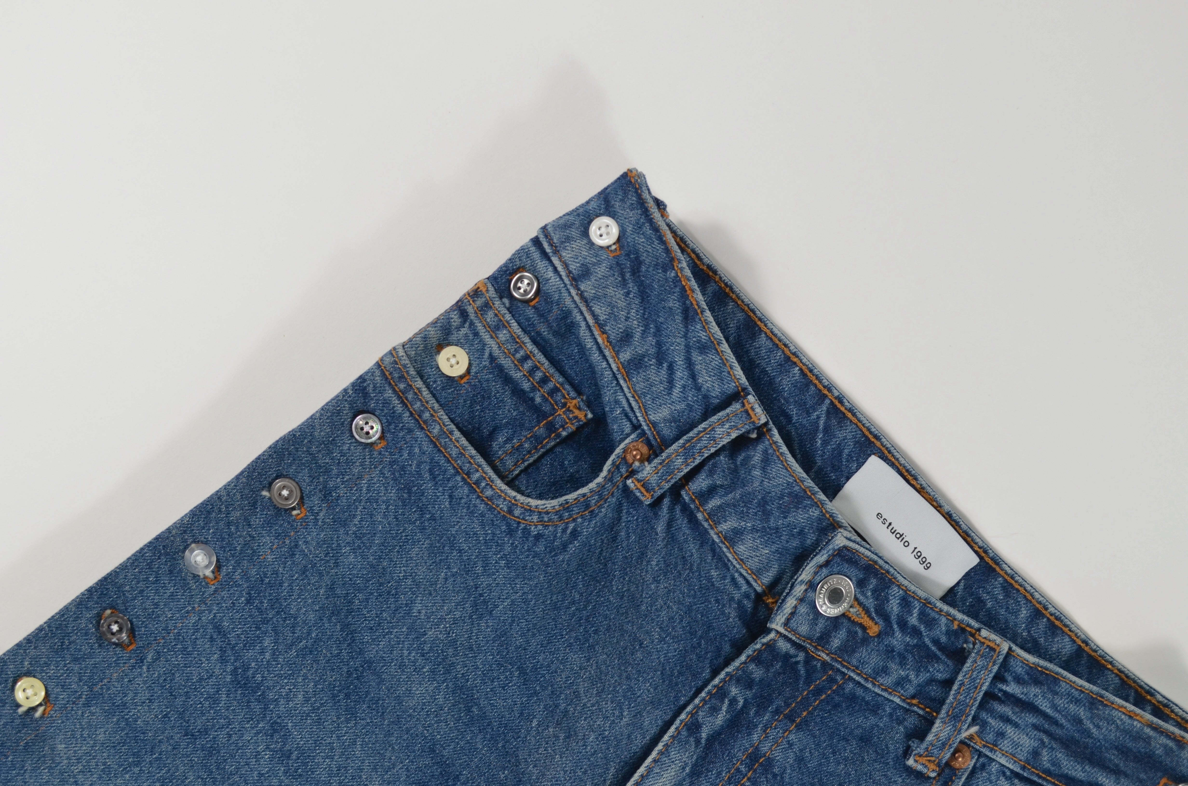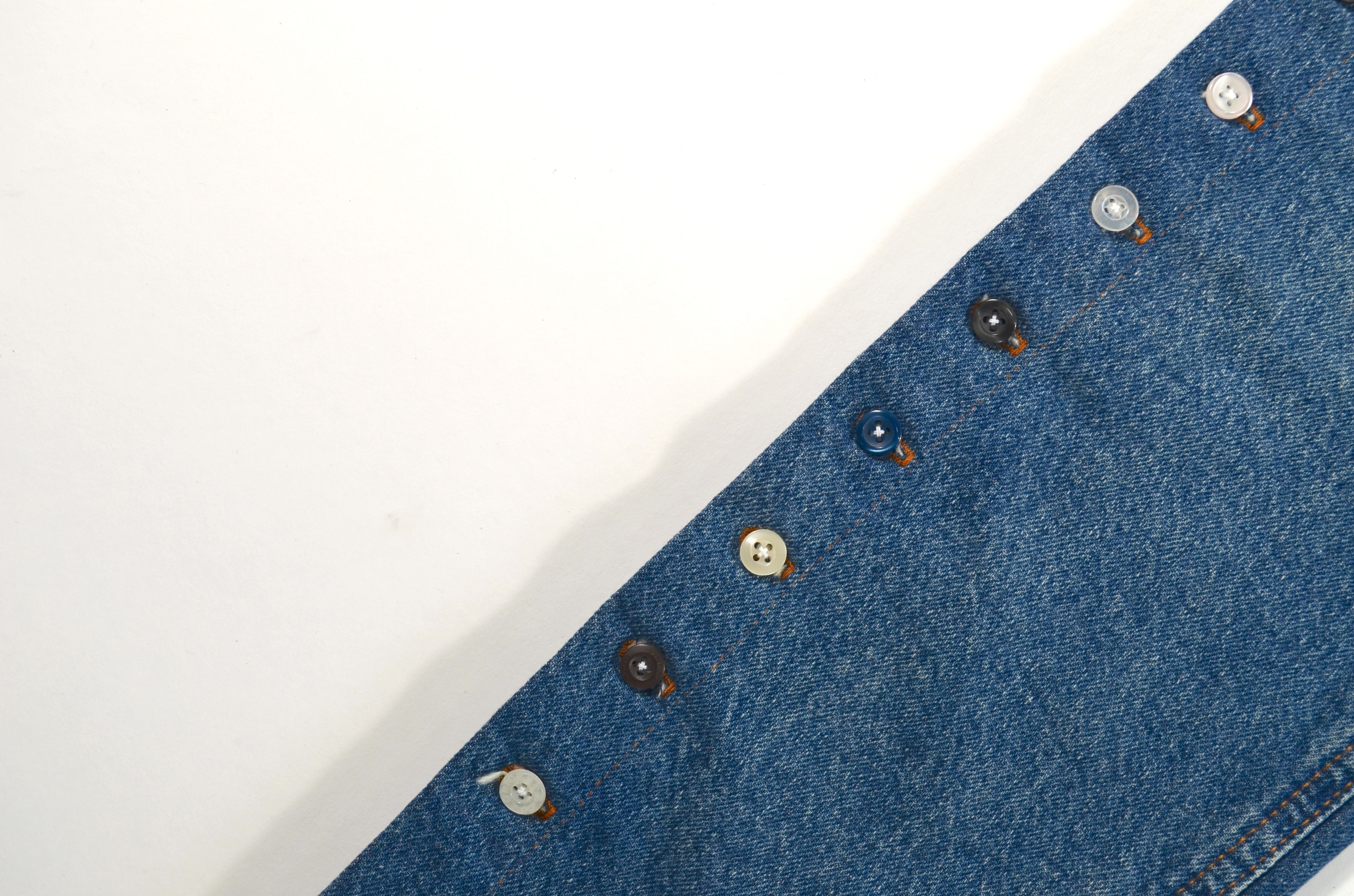 Jean transformado en los costados con botones de las camisas que hemos transformado, estilo aletilla camisa que se abre por completo de los lados. Trabajo manual y detallado.
