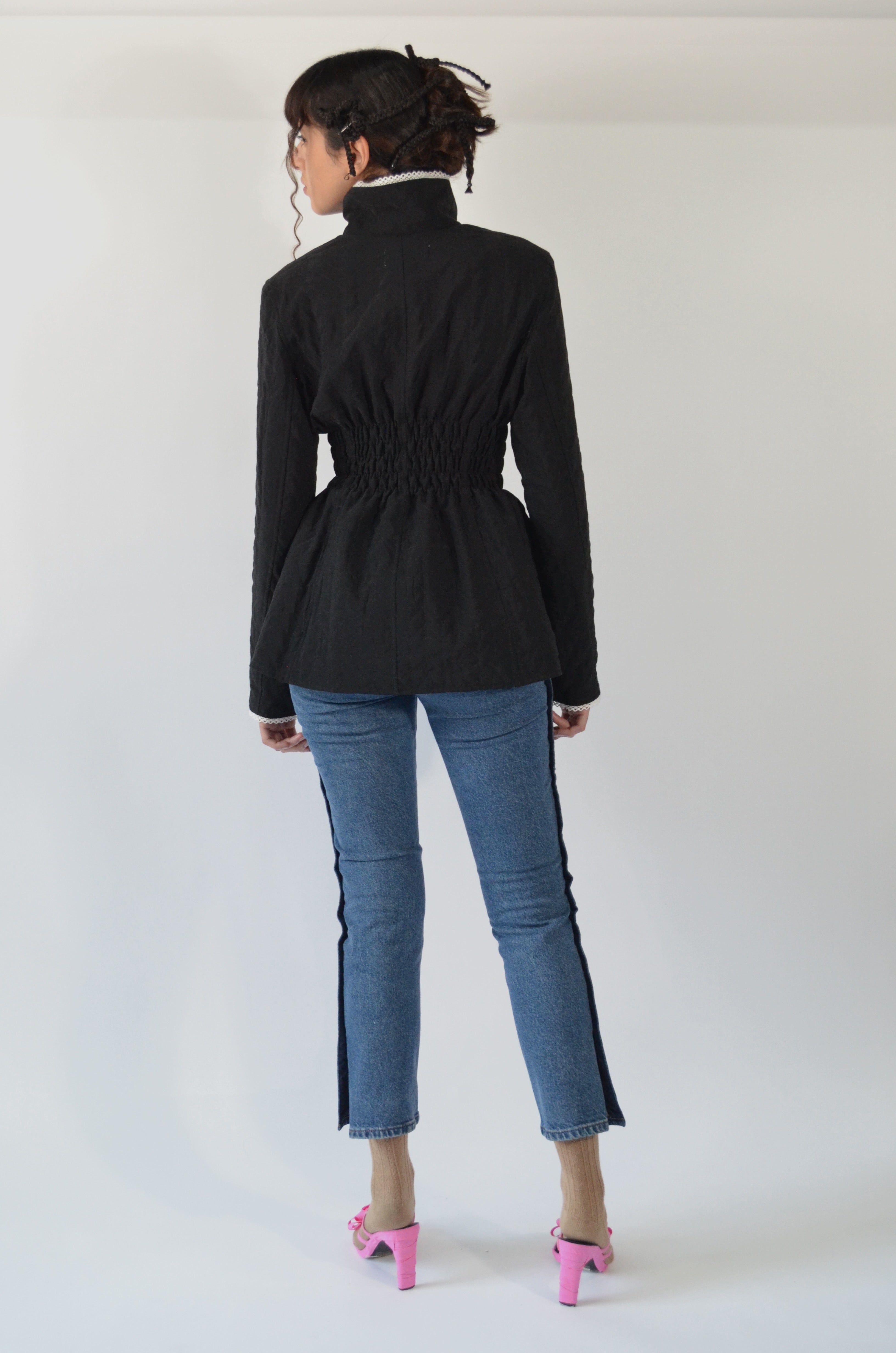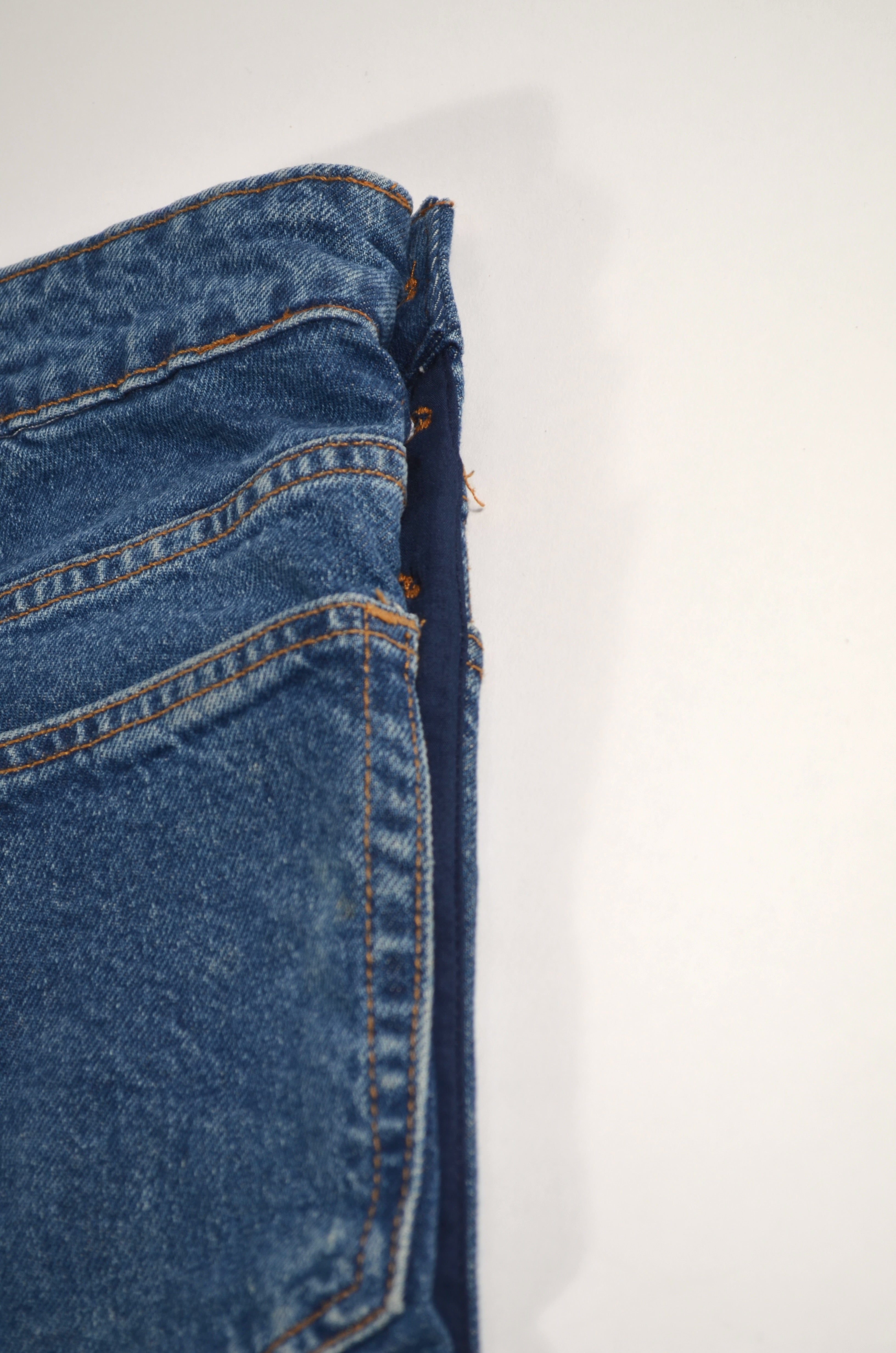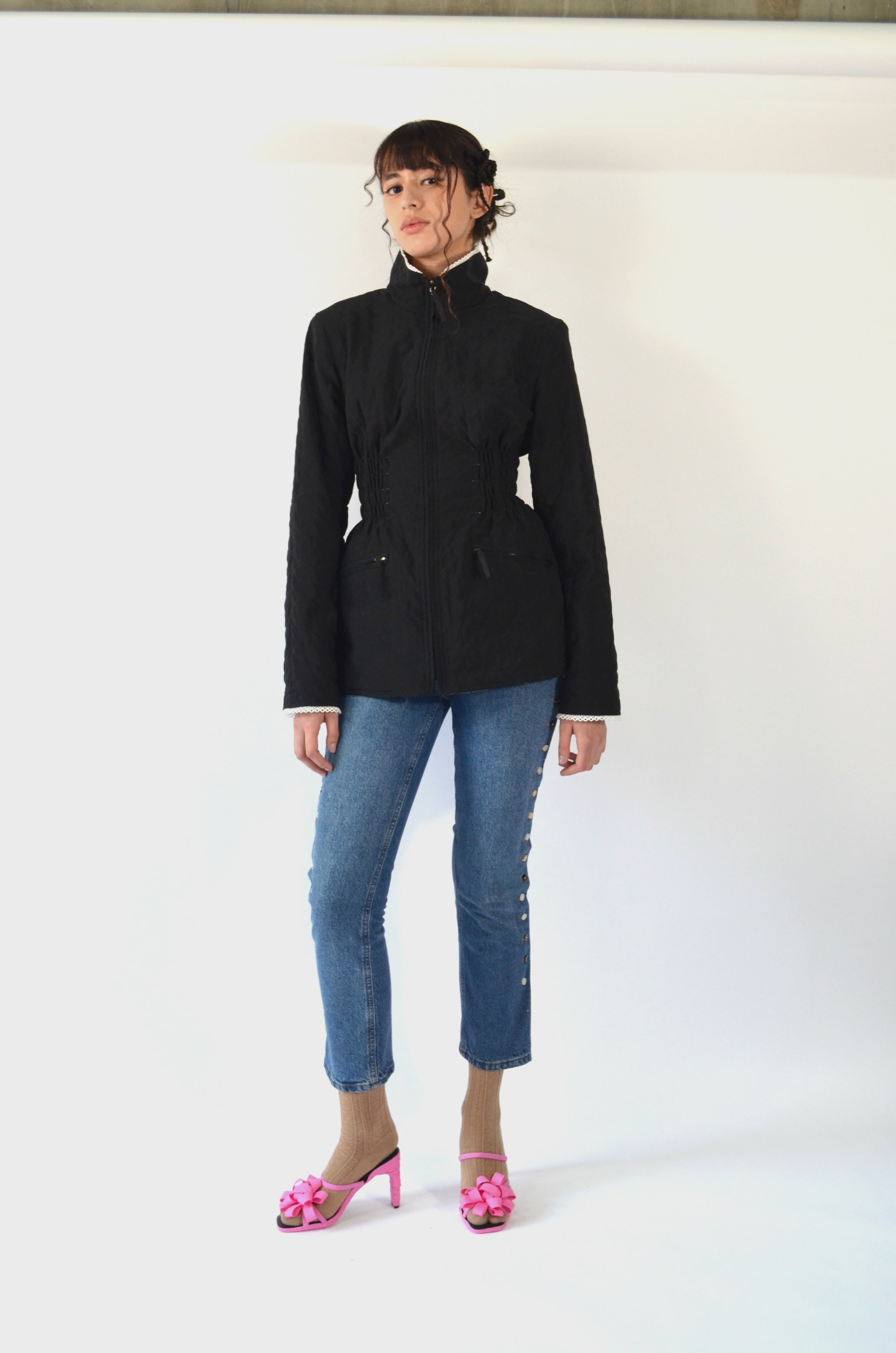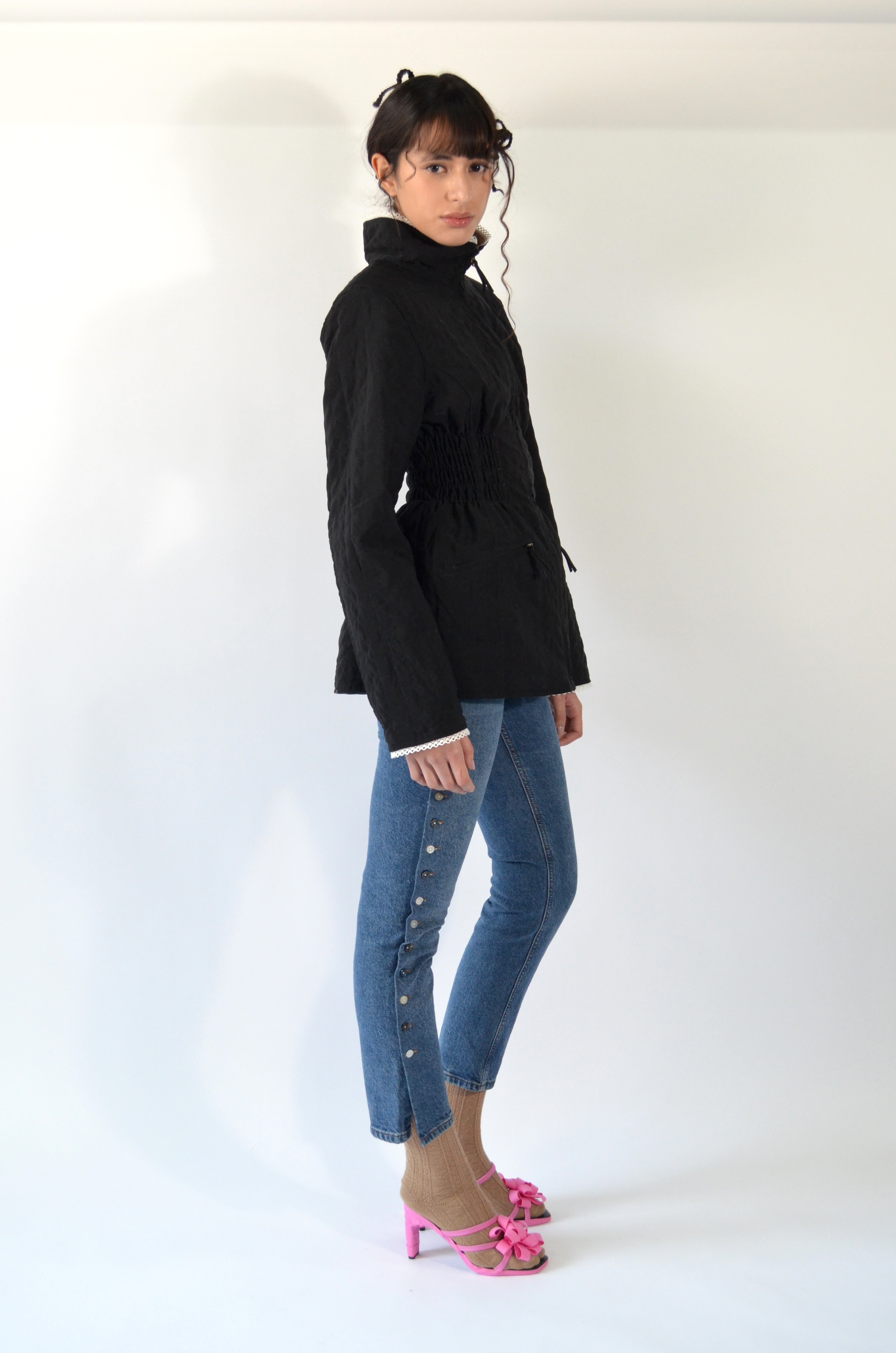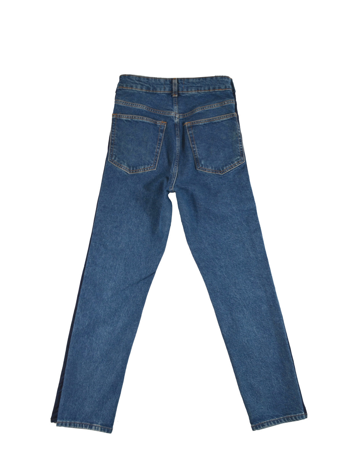 Jean transformado en los costados con botones de las camisas que hemos transformado, estilo aletilla camisa que se abre por completo de los lados. Trabajo manual y detallado.