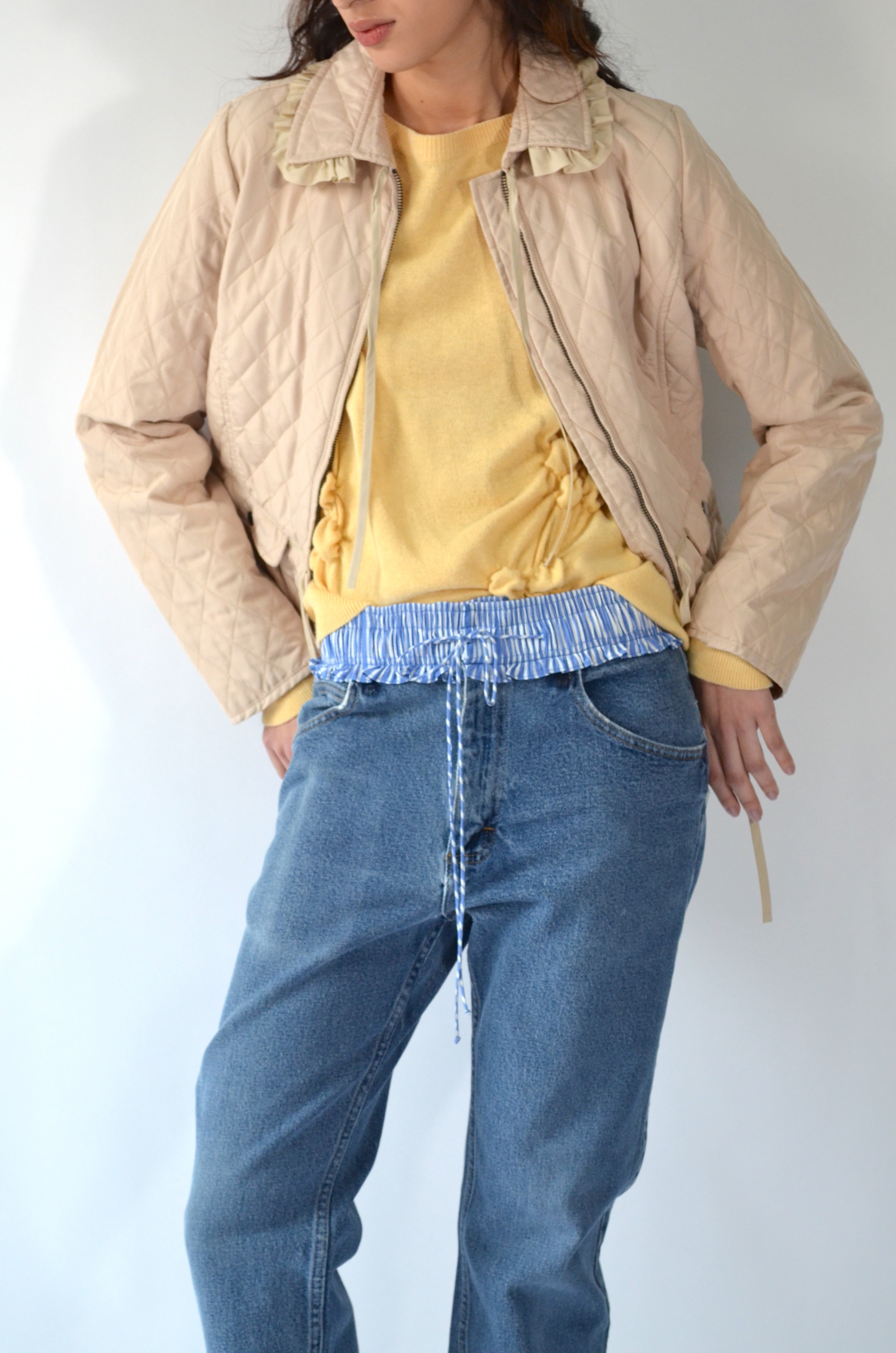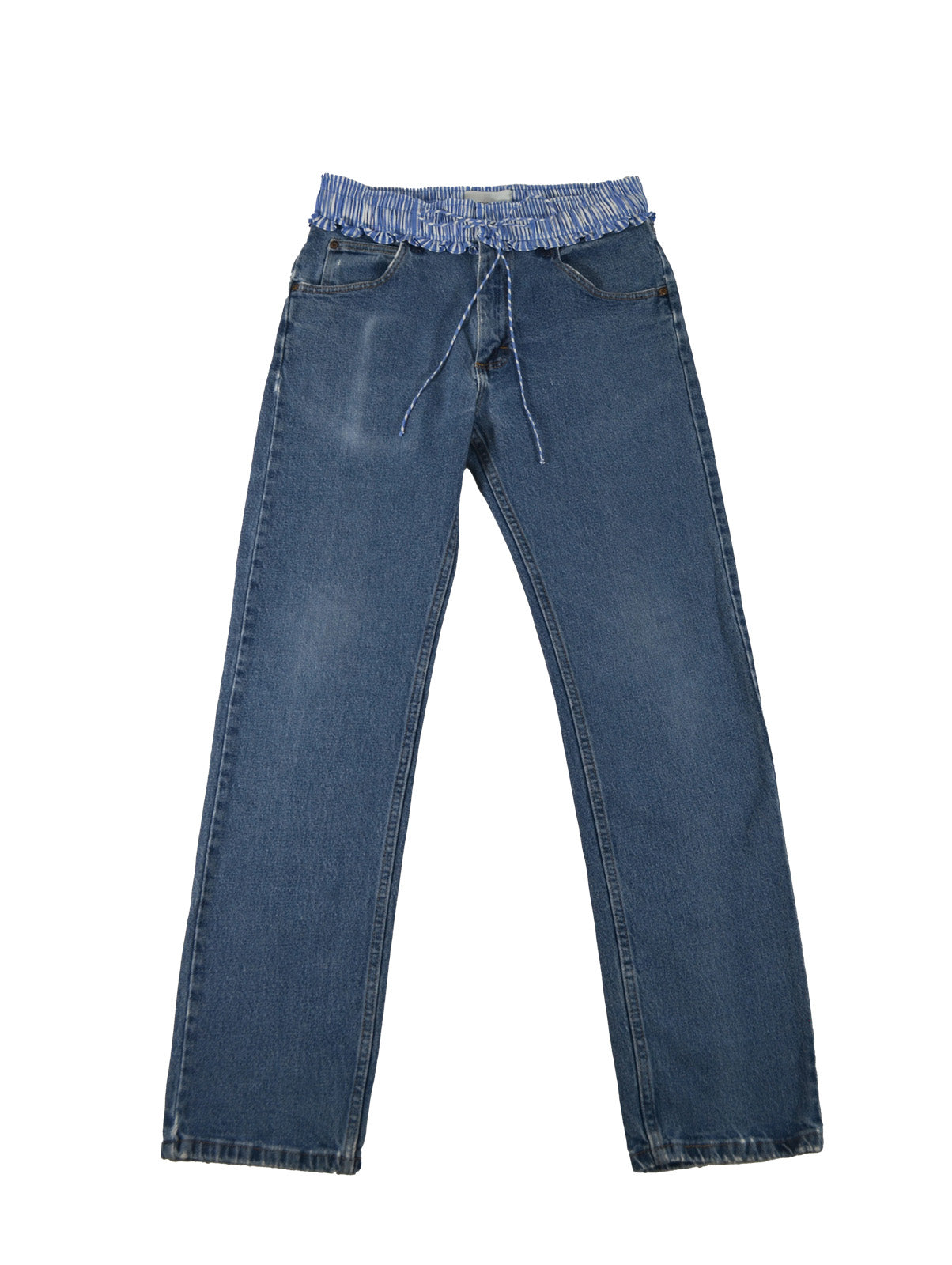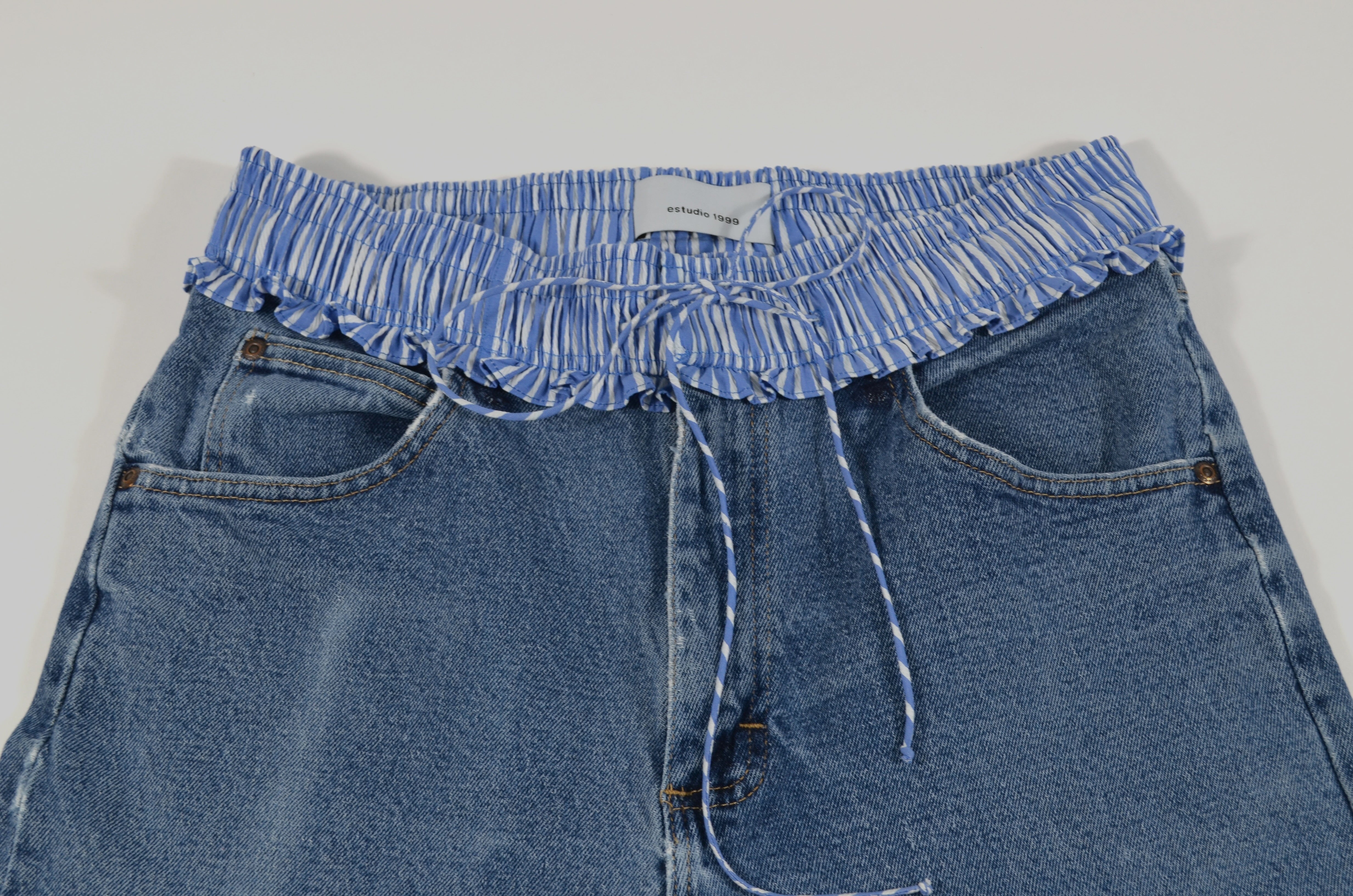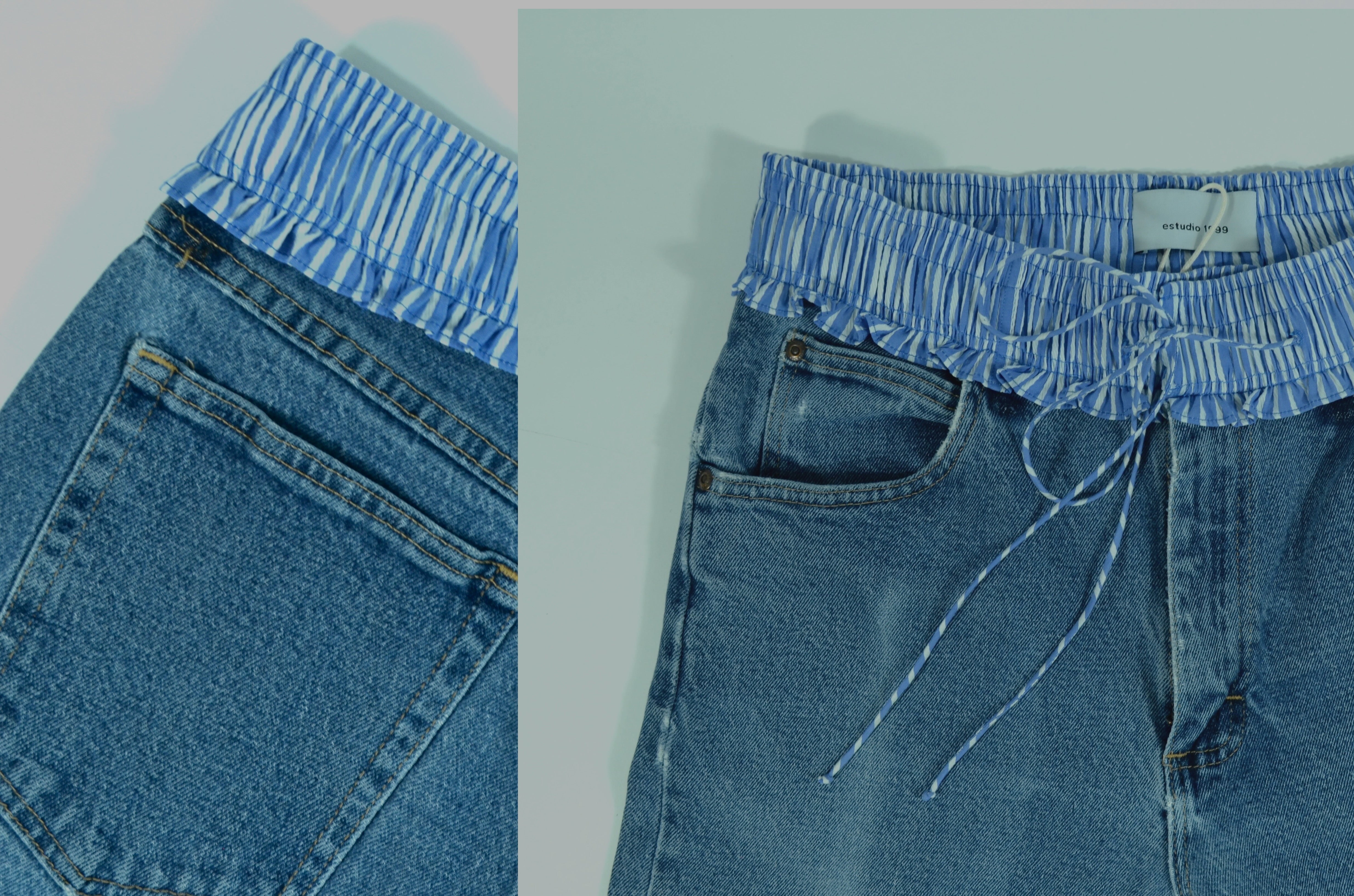 Jean transformado con una pretina inspirada en la coqueteria de la ropa interior. Plisado con fragmentos de camisas y cinta decorativa, cada uno es una pieza única.