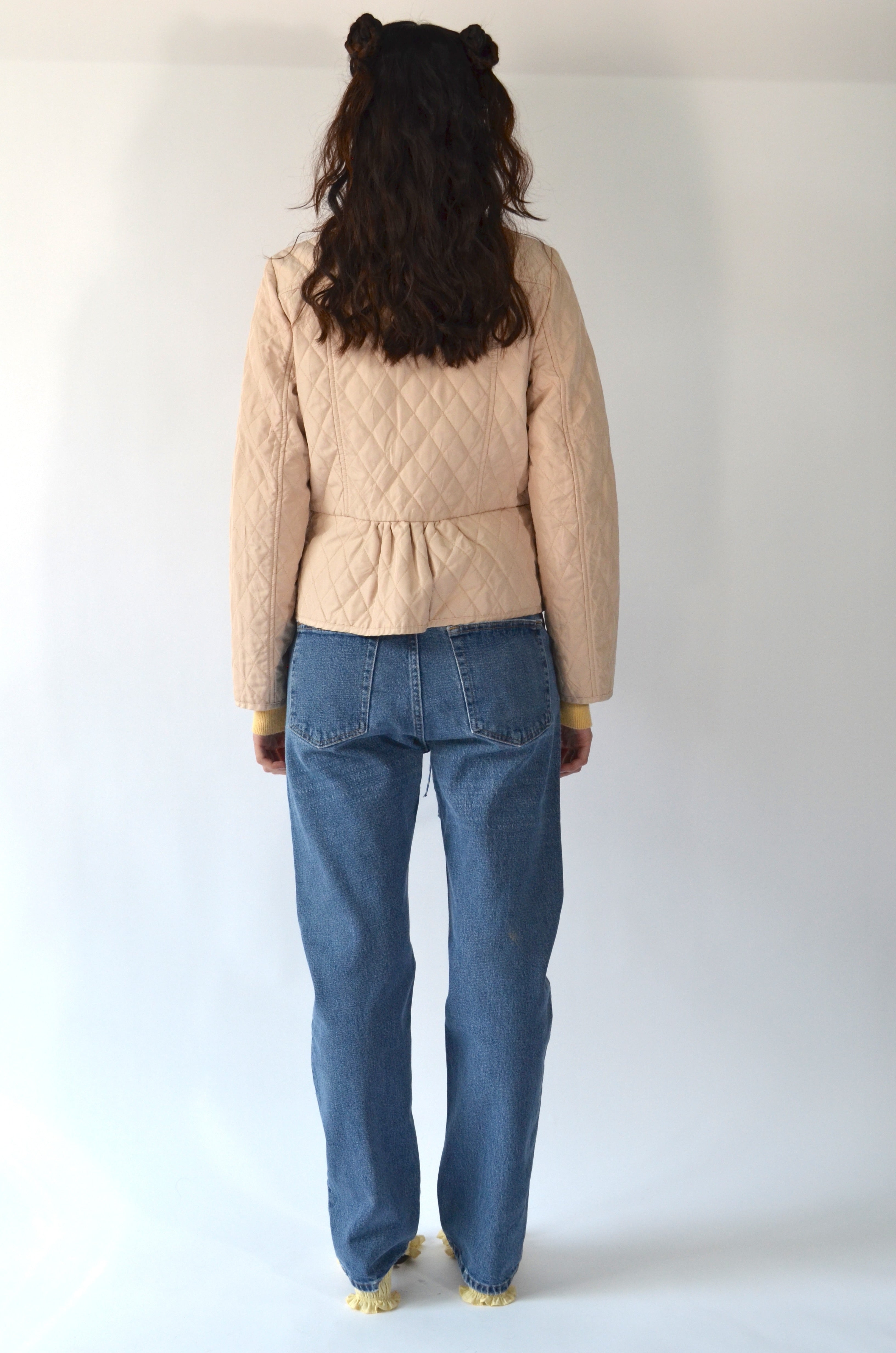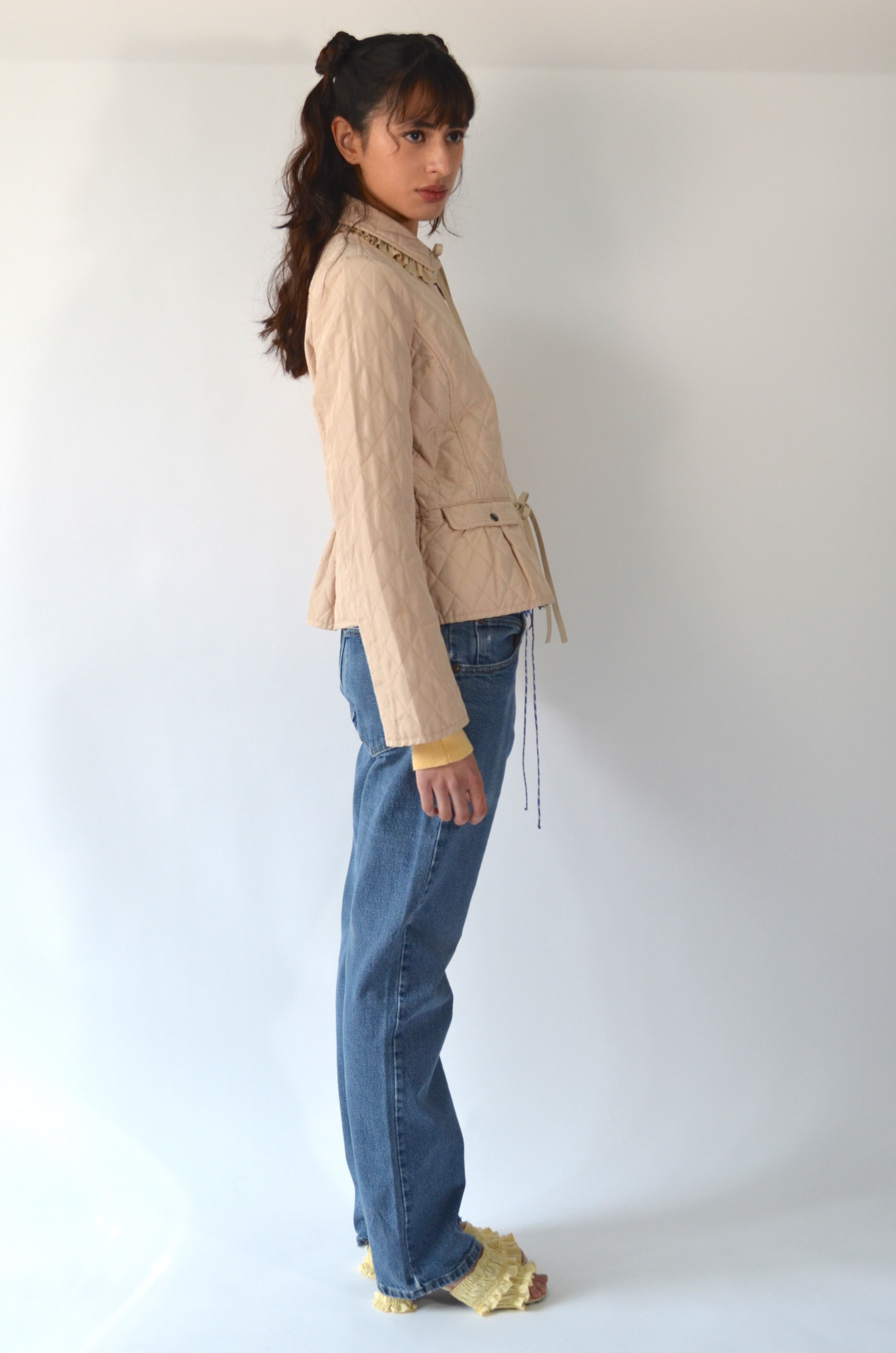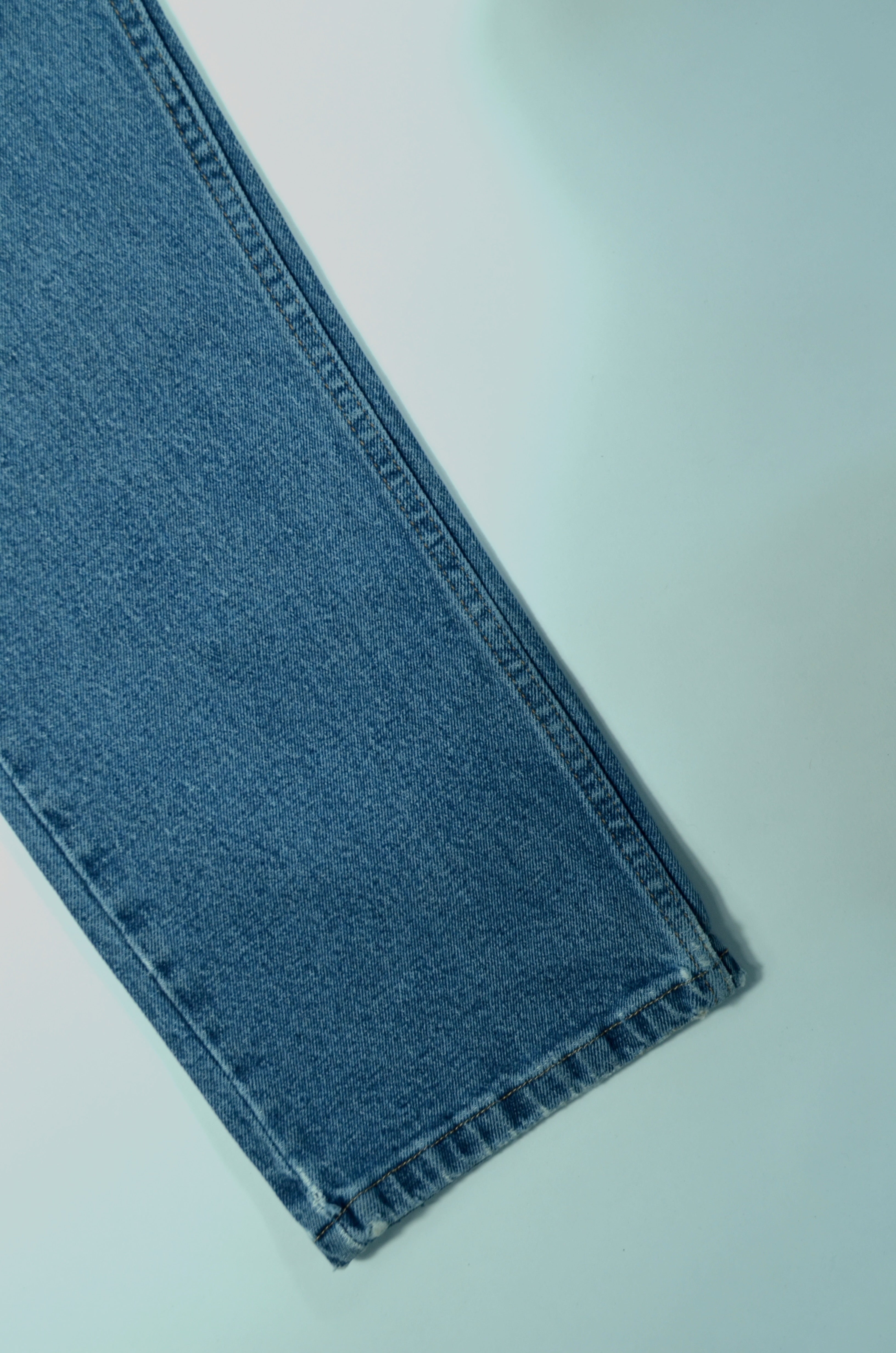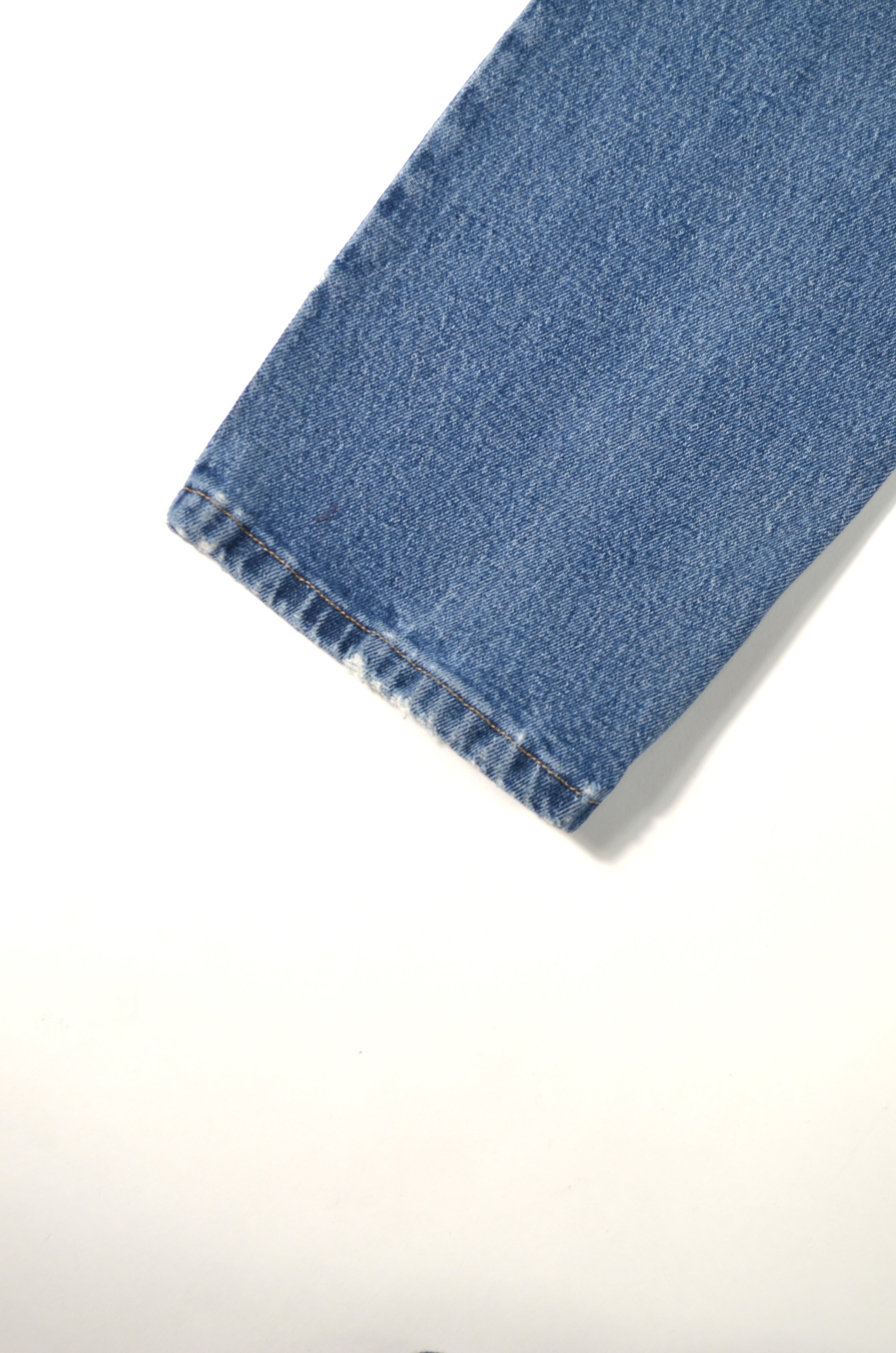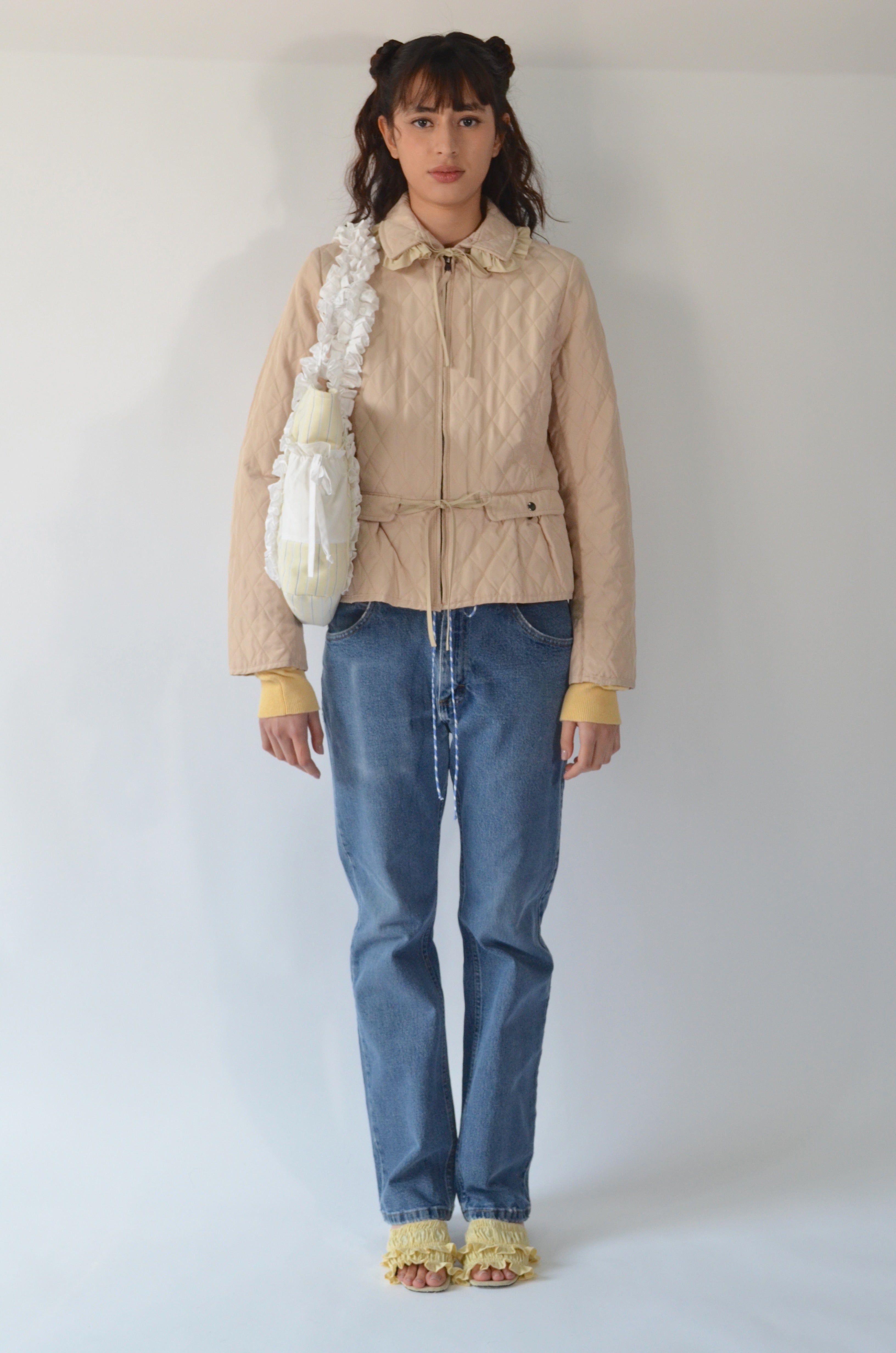 Jean transformado con una pretina inspirada en la coqueteria de la ropa interior. Plisado con fragmentos de camisas y cinta decorativa, cada uno es una pieza única.