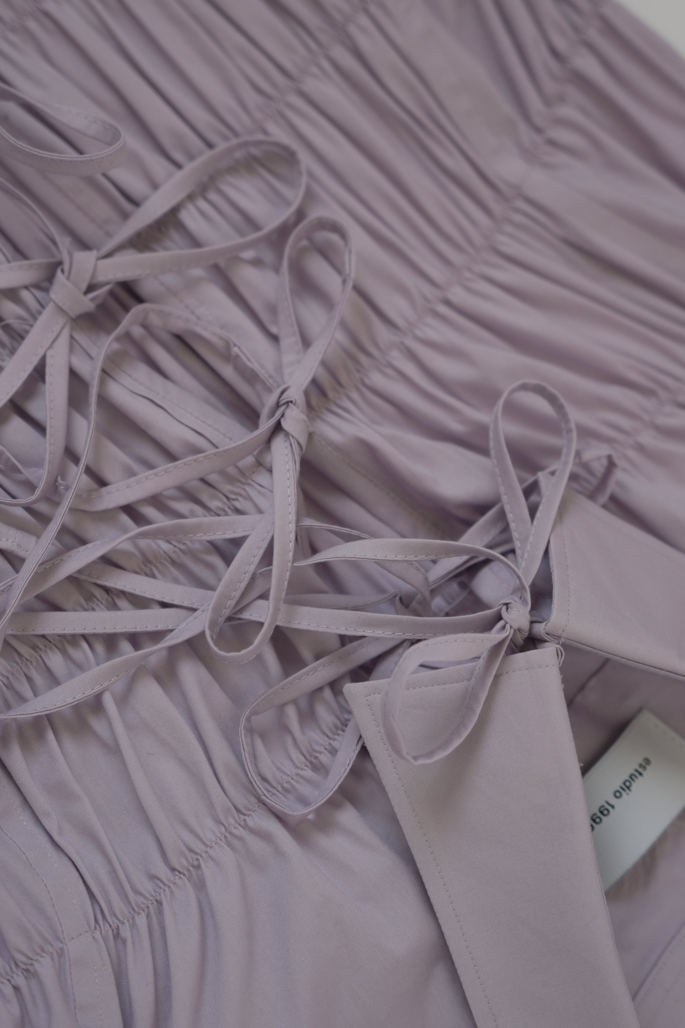Camisa oversize larga con resortes en todo el contorno inspirada en la textura de la espuma. Con cintas para amarrar en la aletilla, juega con ellas para crear diferentes looks.