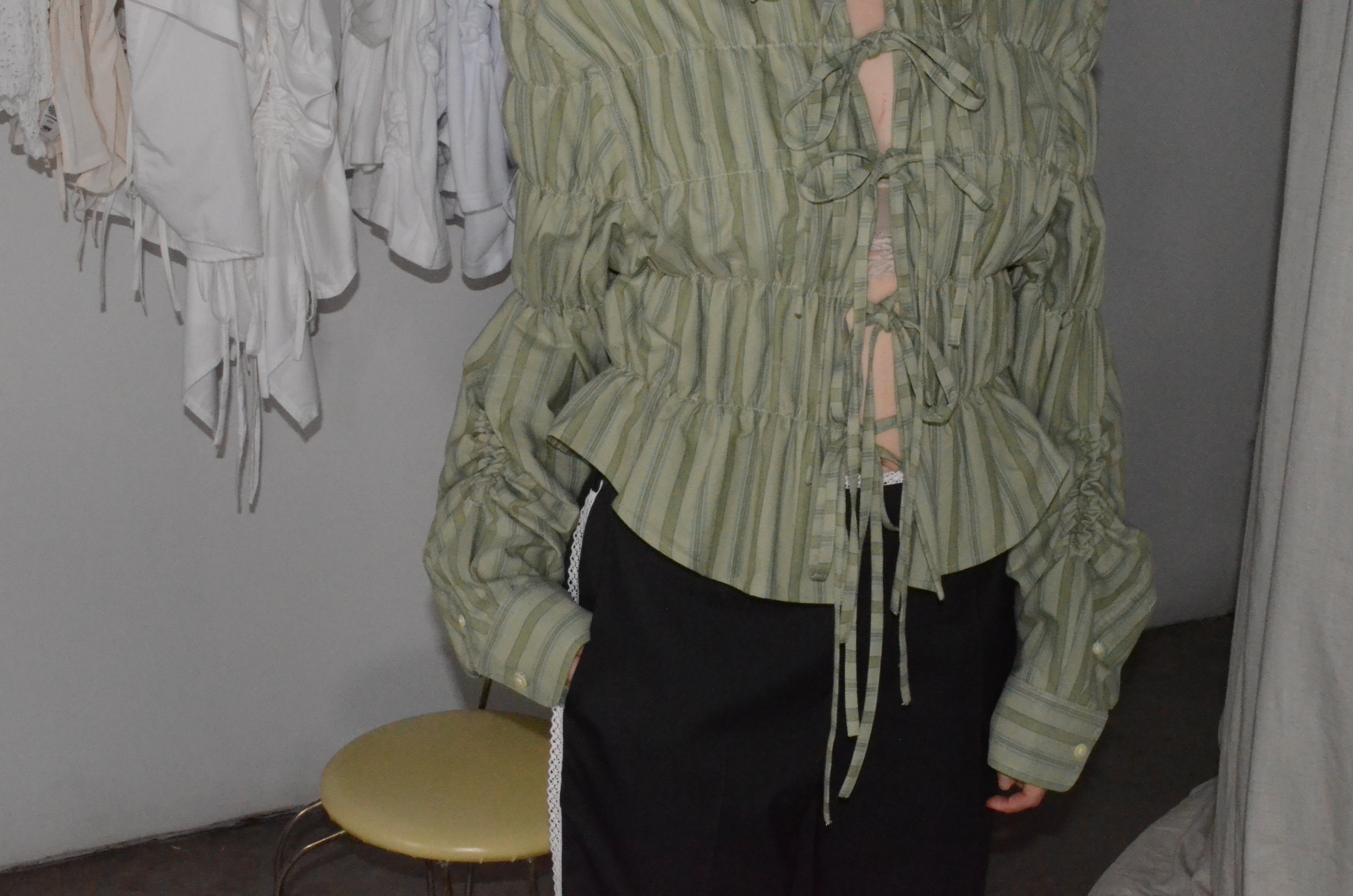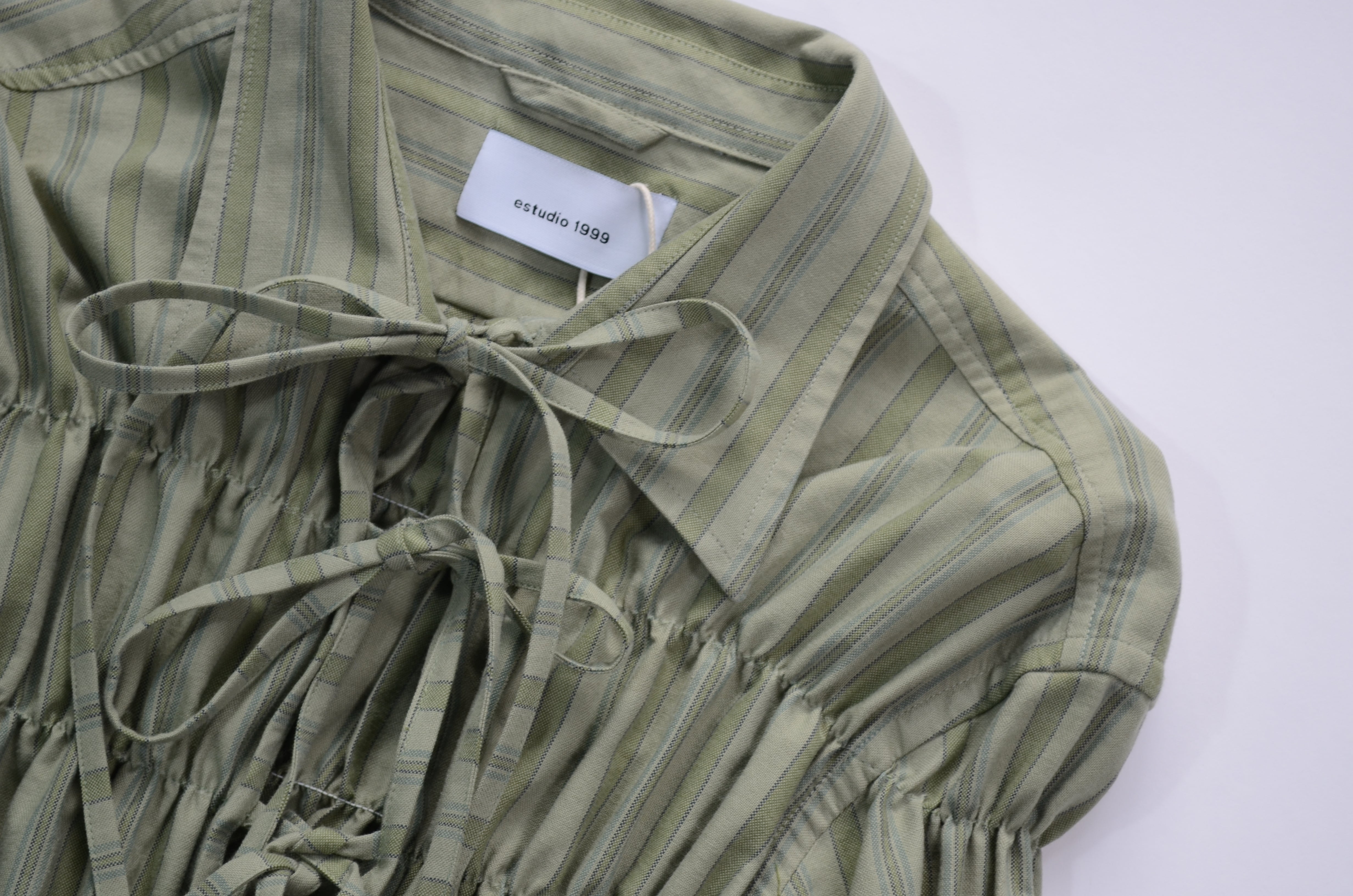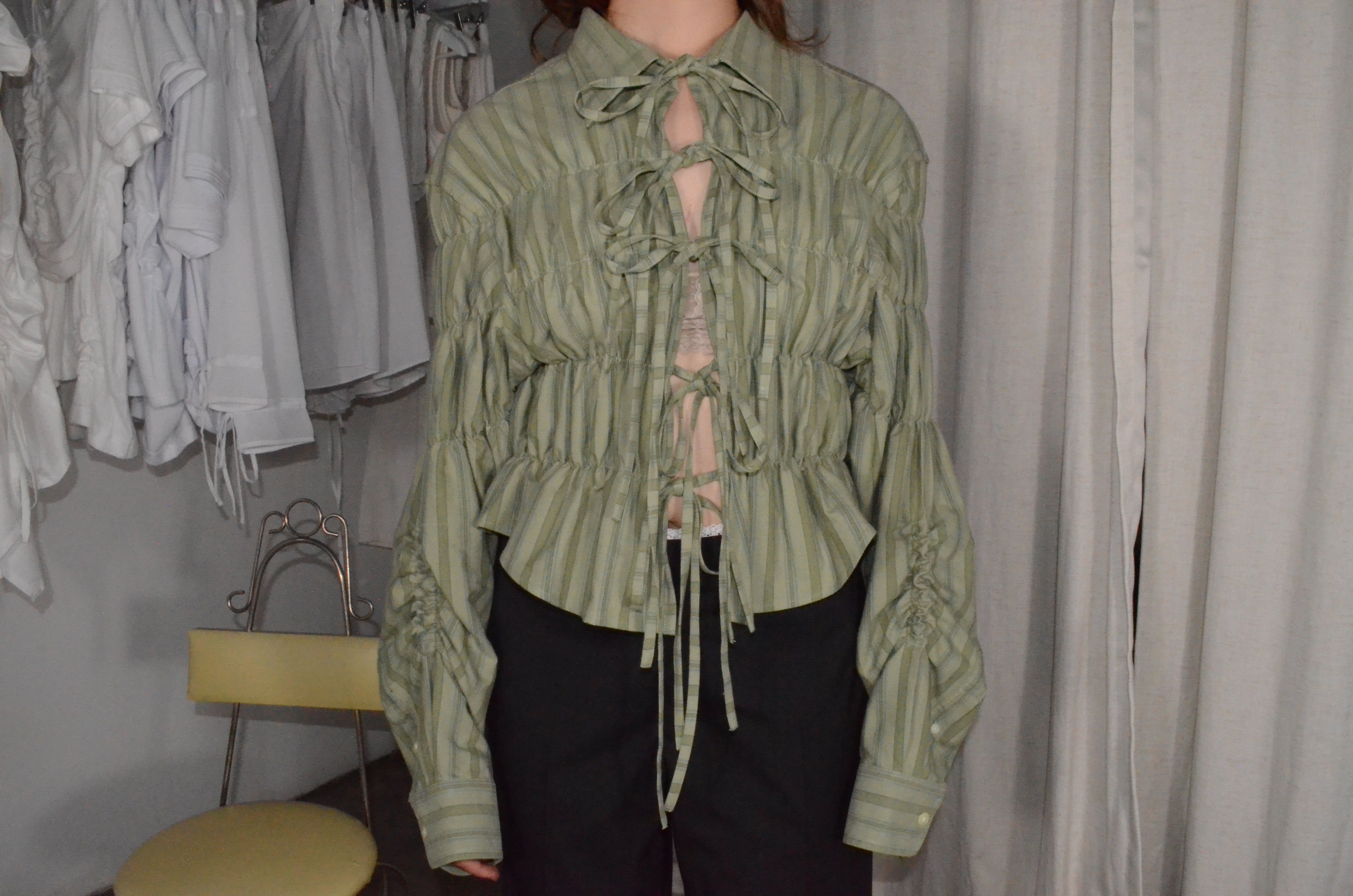 Camisa oversize larga con resortes en todo el contorno inspirada en la textura de la espuma. Con cintas para amarrar en la aletilla, juega con ellas para crear diferentes looks.