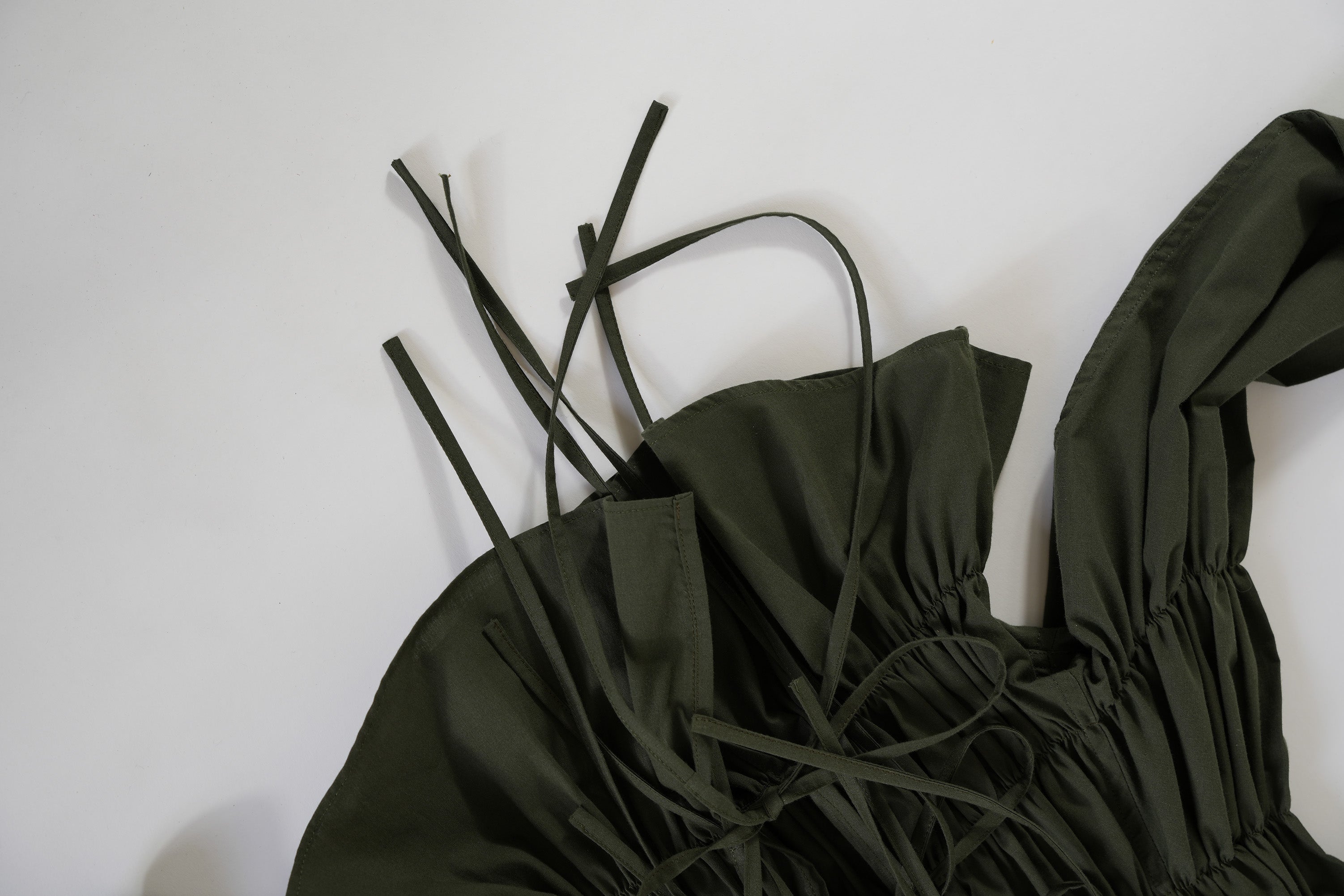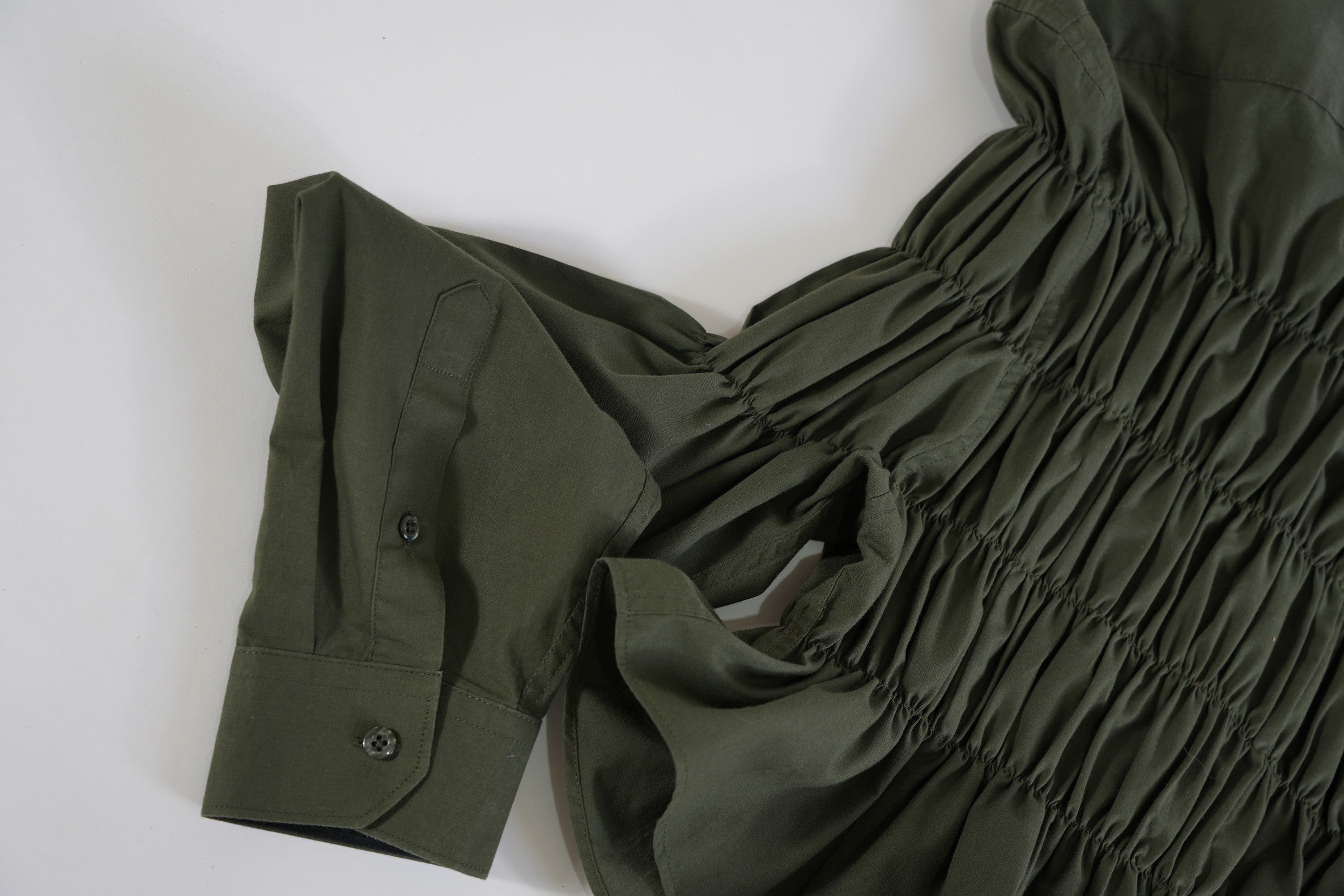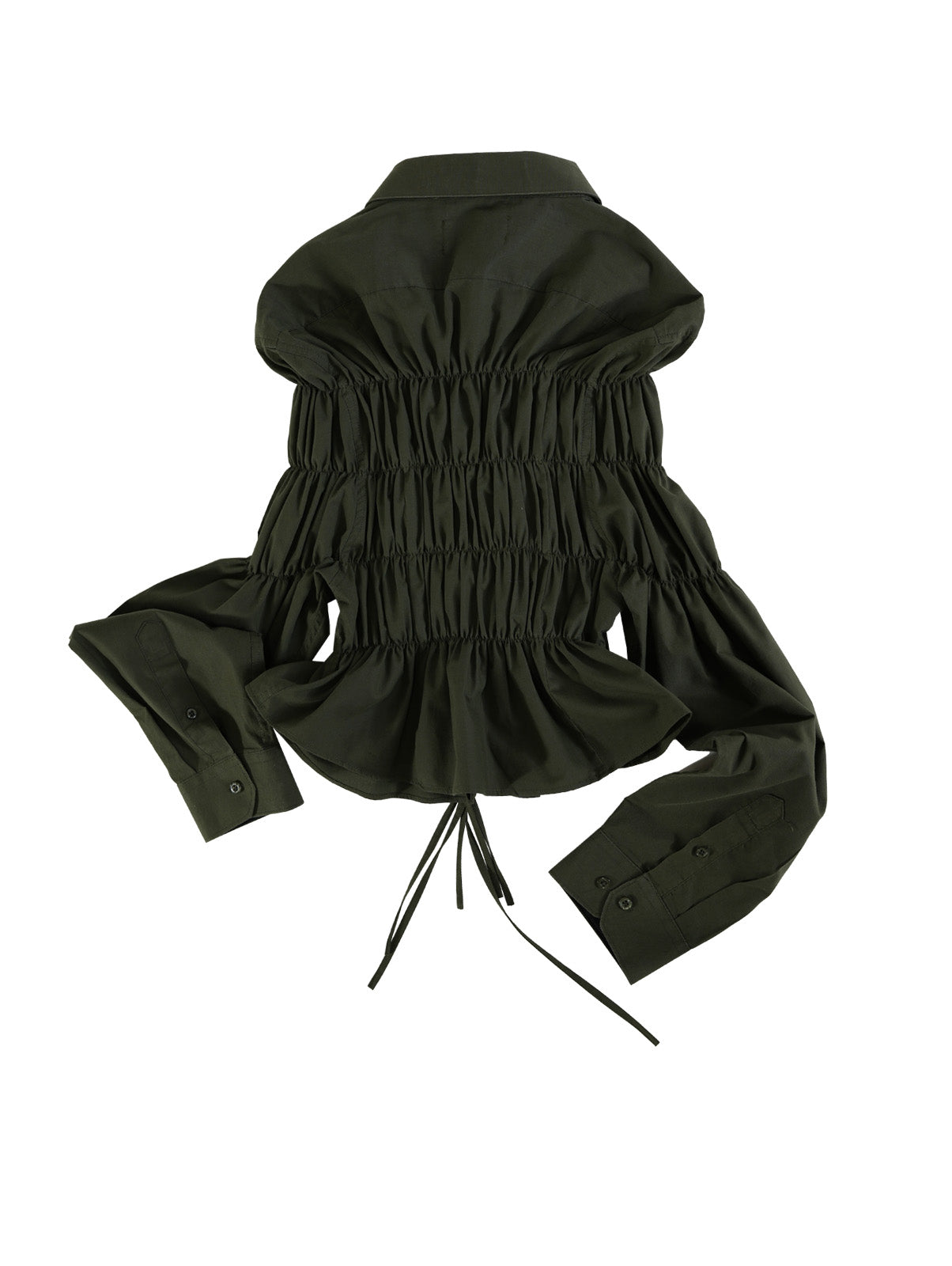 Camisa oversize larga con resortes en todo el contorno inspirada en la textura de la espuma. Con cintas para amarrar en la aletilla, juega con ellas para crear diferentes looks.