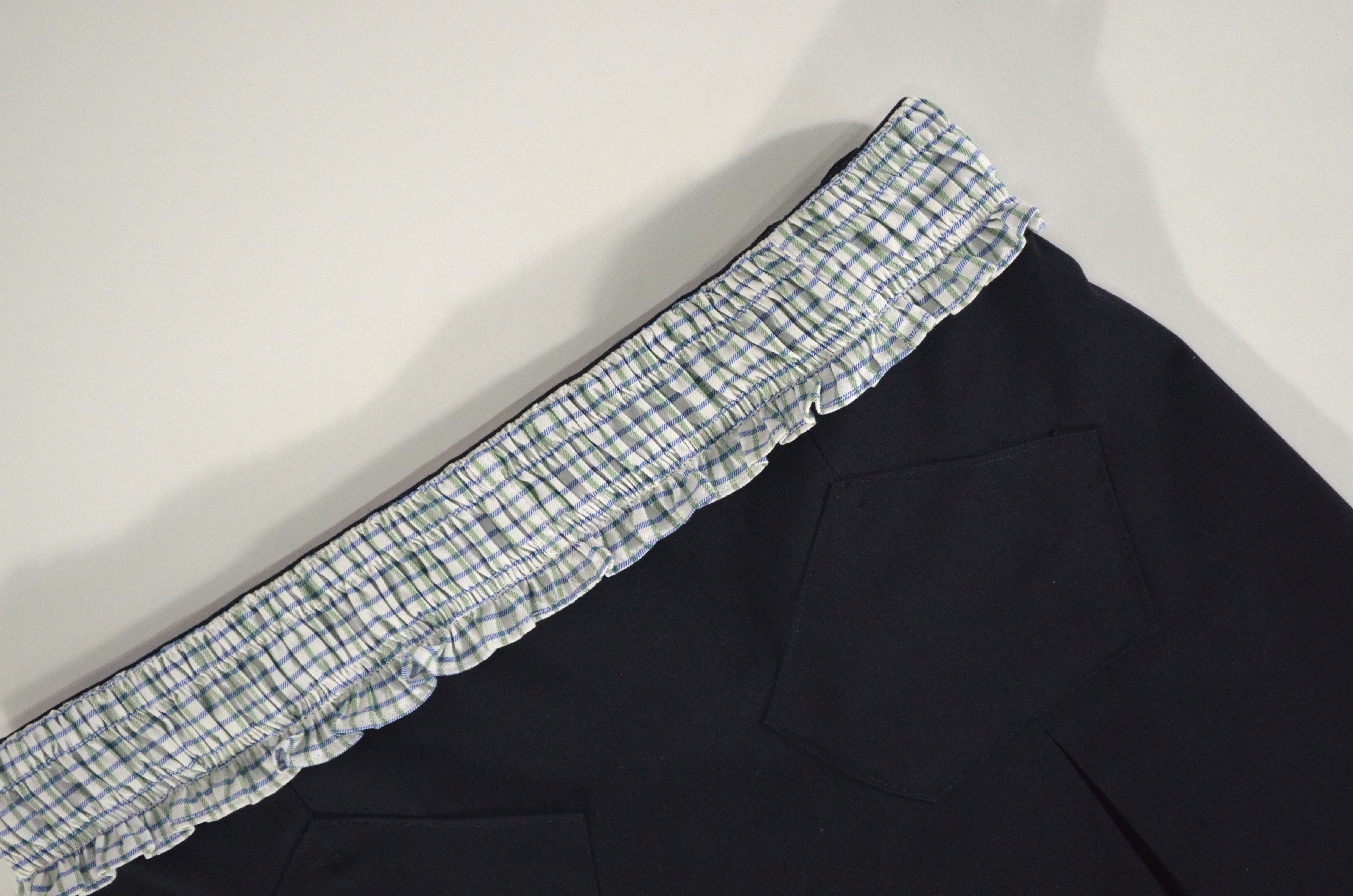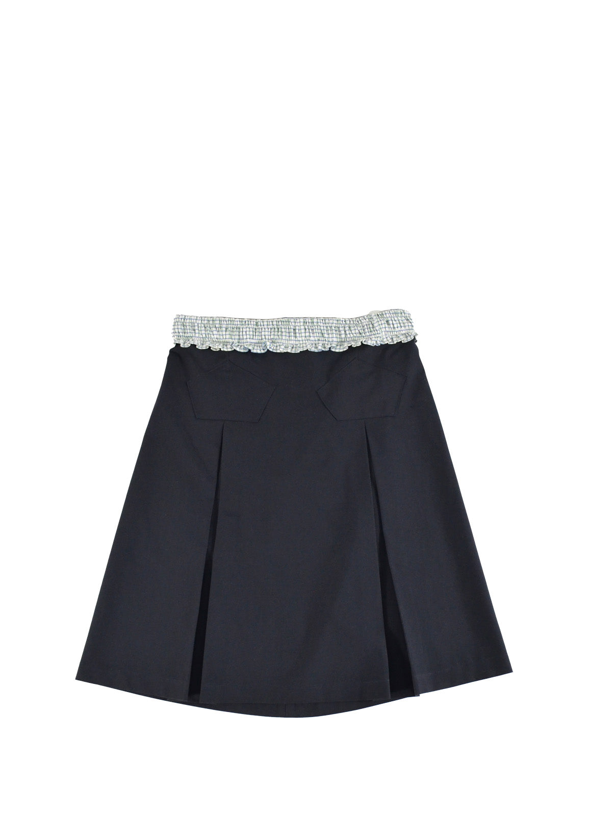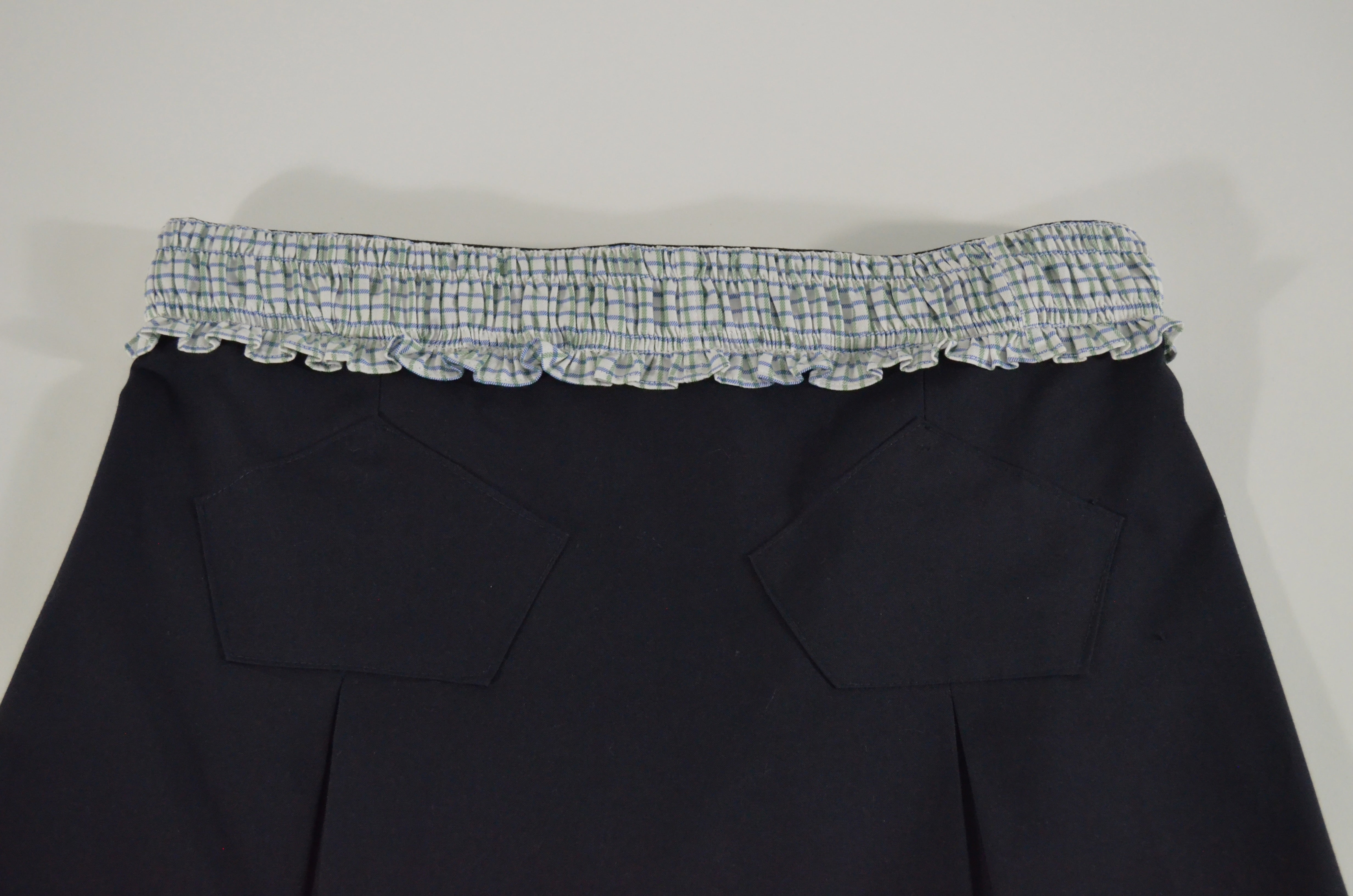 Falda de tablones reinterpretada, estilo escolar con una pretina reinterpretada que combina tela fruncida y un delicado olan. Este detalle aporta textura, romanticismo y un toque coqueto a la pieza, equilibrando estructura y suavidad. Parches frontales decorativos de la misma tela. Pretina con elástico en la parte trasera.
