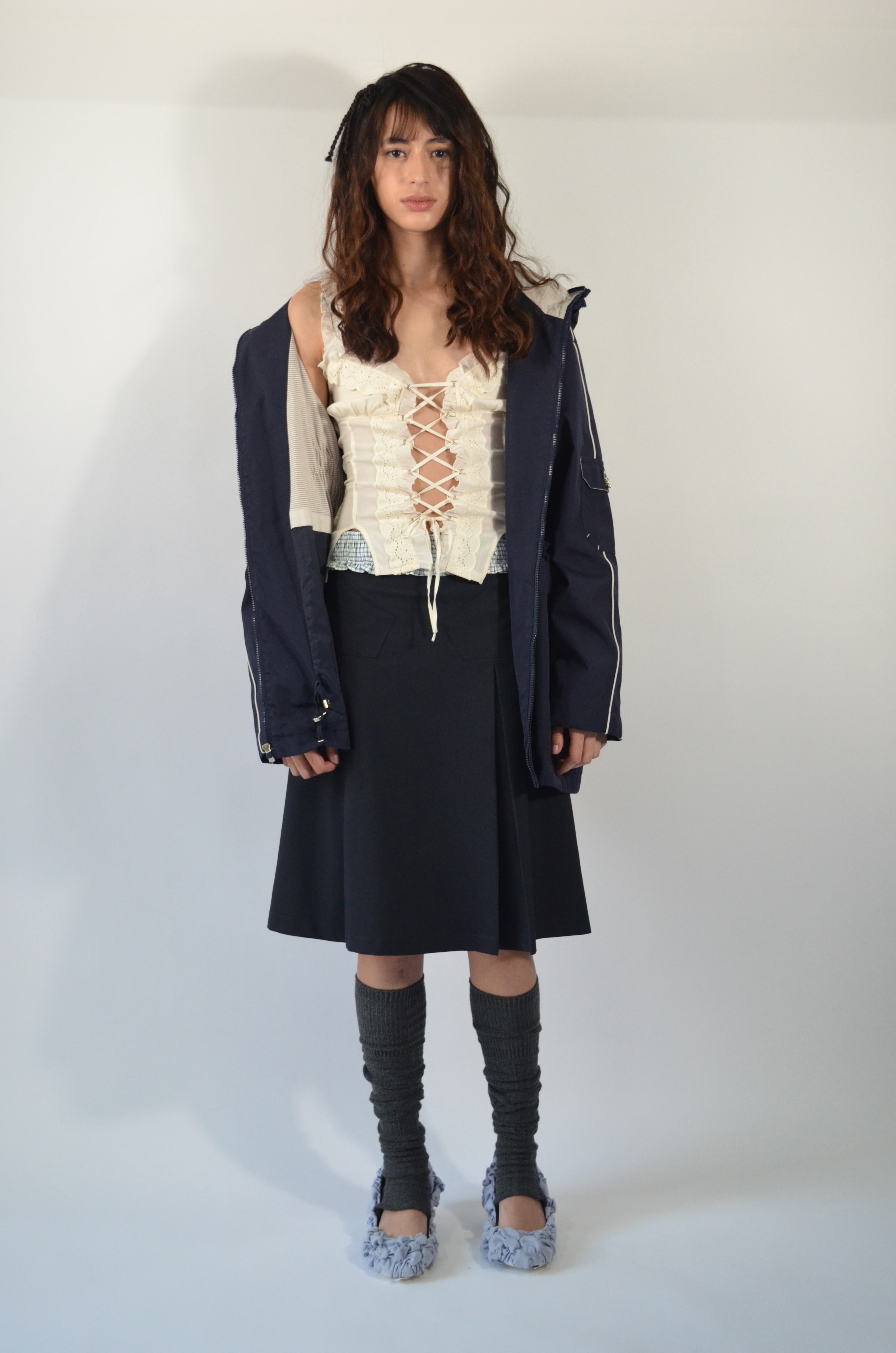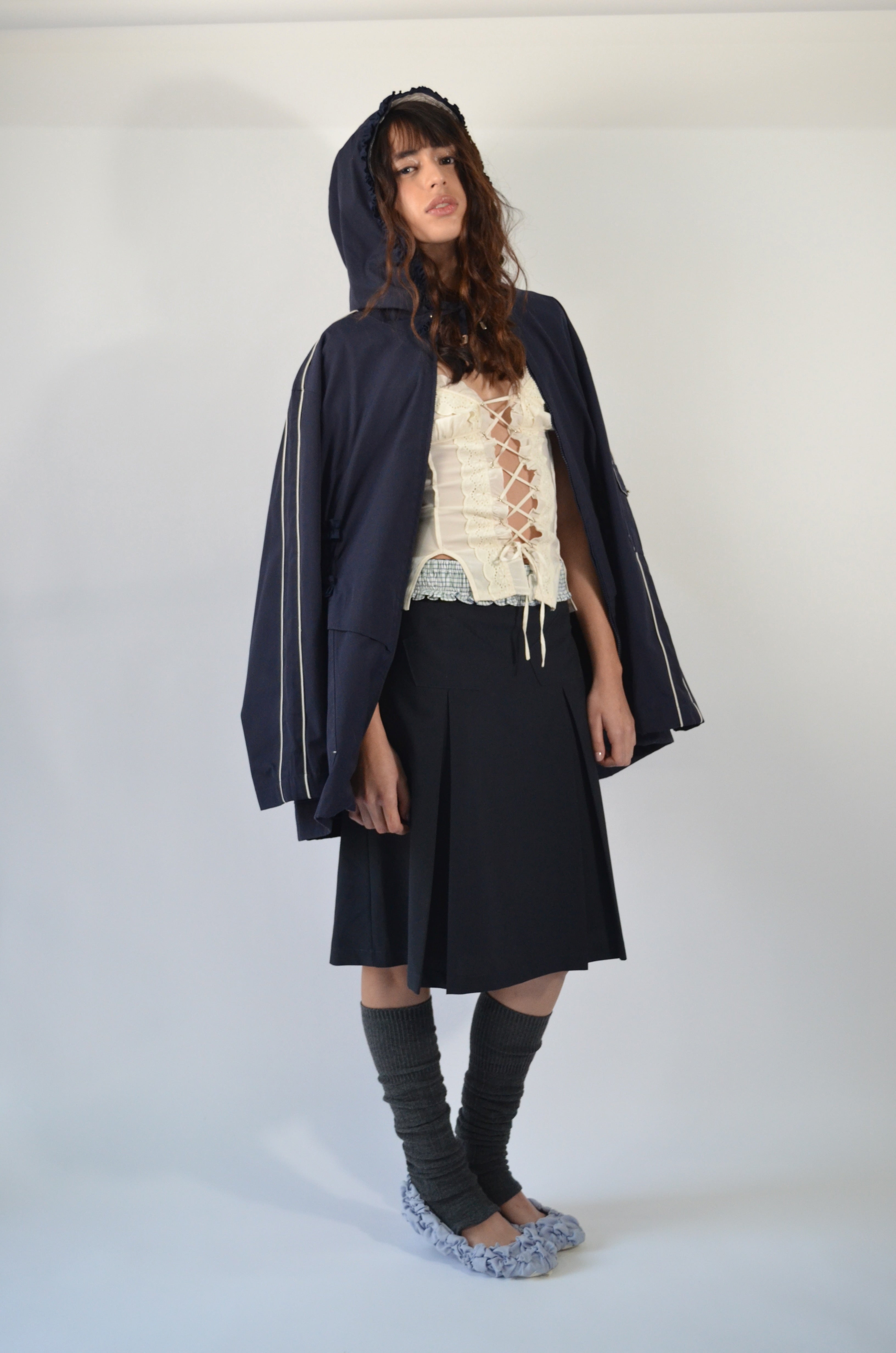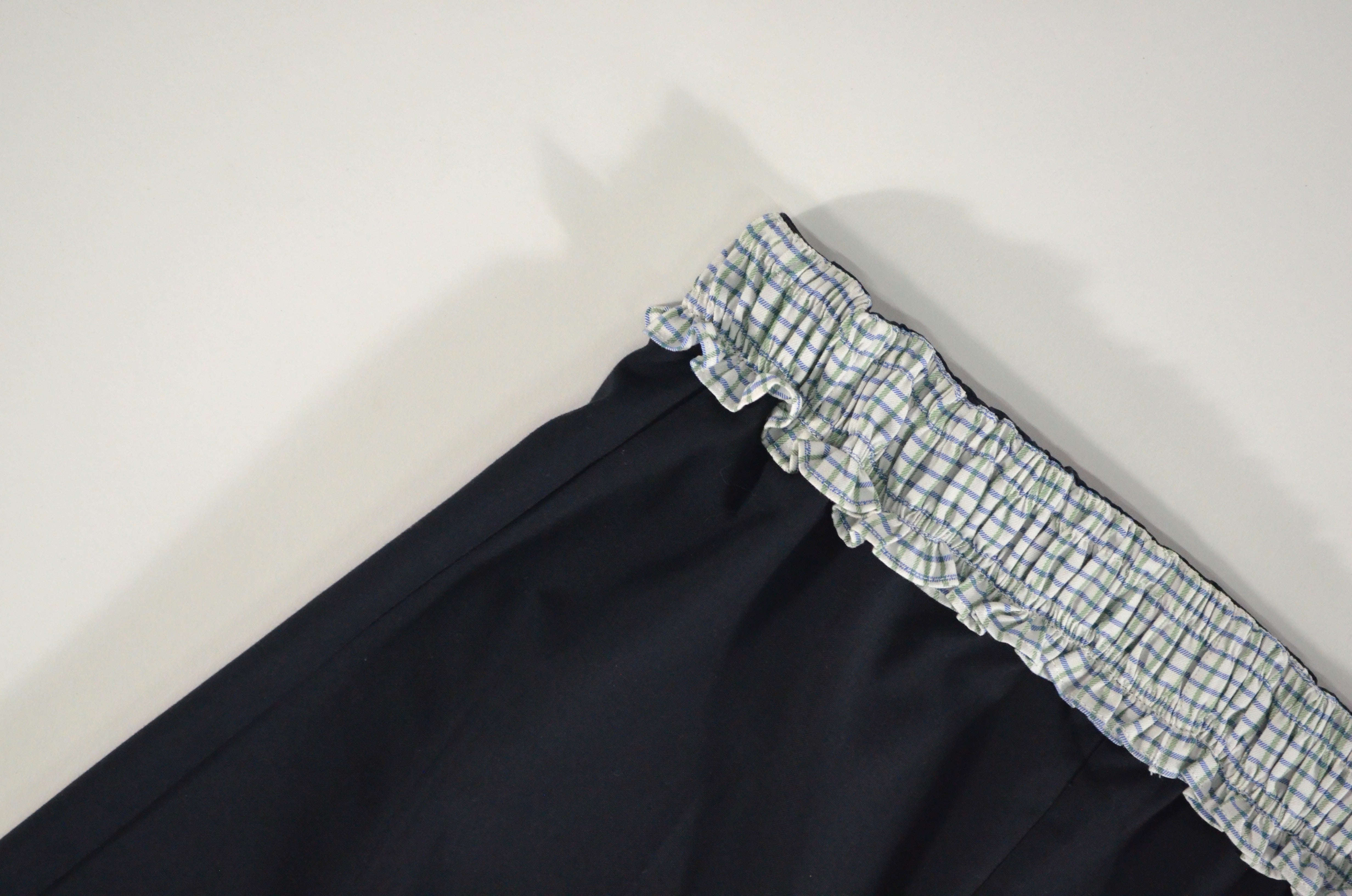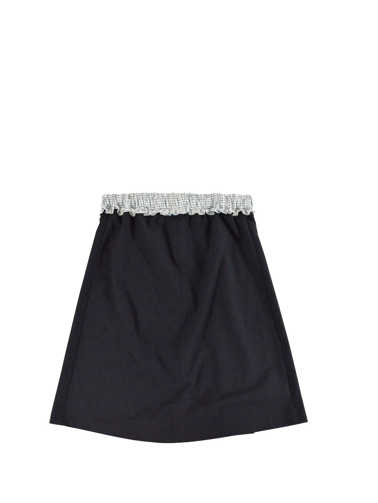 Falda de tablones reinterpretada, estilo escolar con una pretina reinterpretada que combina tela fruncida y un delicado olan. Este detalle aporta textura, romanticismo y un toque coqueto a la pieza, equilibrando estructura y suavidad. Parches frontales decorativos de la misma tela. Pretina con elástico en la parte trasera.