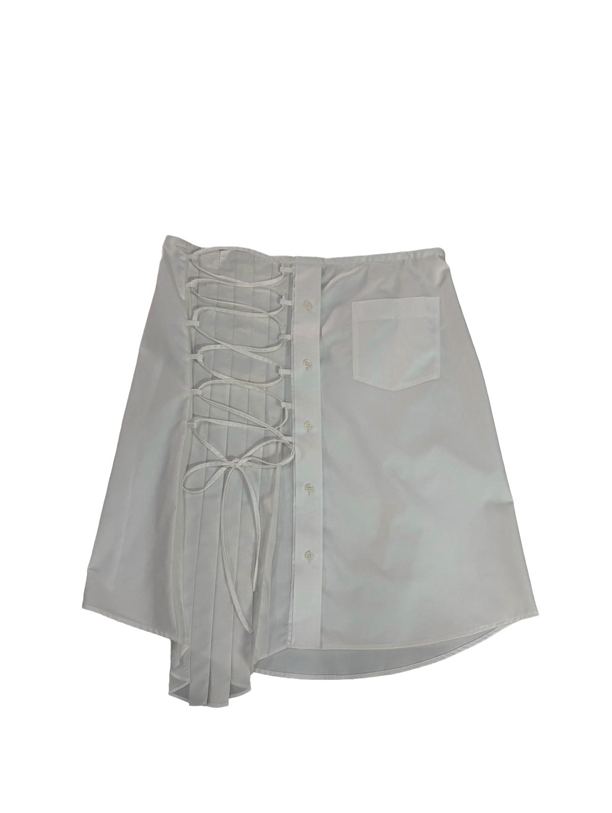 Falda midi creada a partir de camisas, dándoles una nueva vida. Diseño ajustable con cinta estilo corset, adaptable a la cintura o la cadera. Cada pieza es única en sus detalles, tela y textura, 1/1.