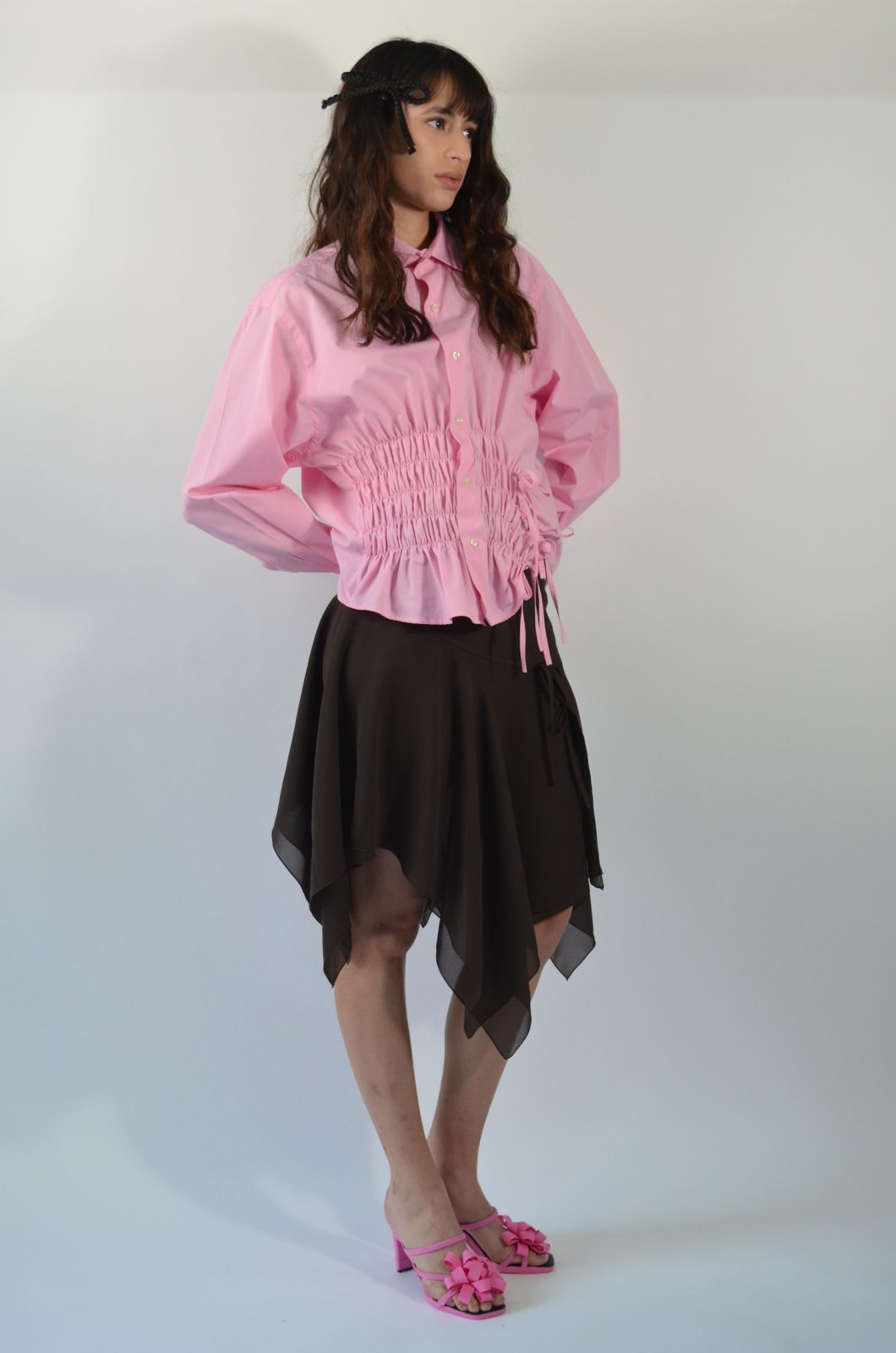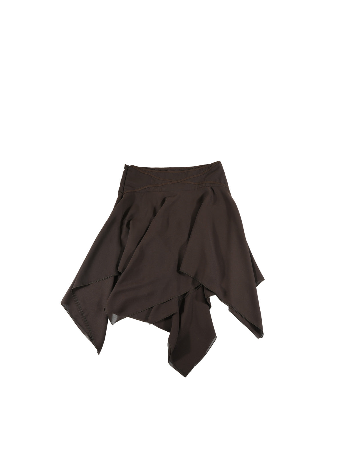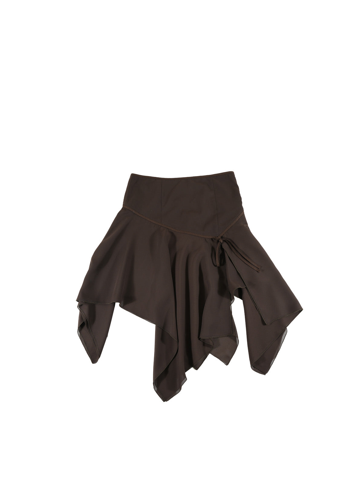 Falda asimétrica de gasa, semi transparente por la doble tela. Con cinta que hace corte en cadera y termina en moño. Abertura en pierna izquierda.