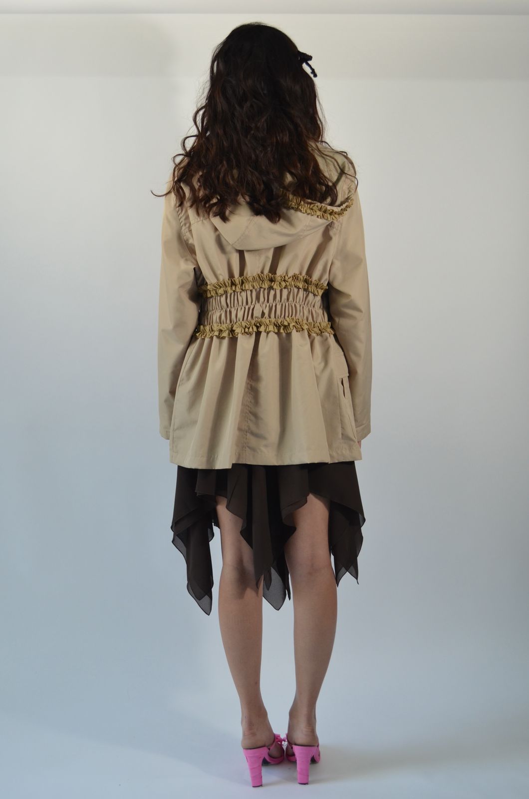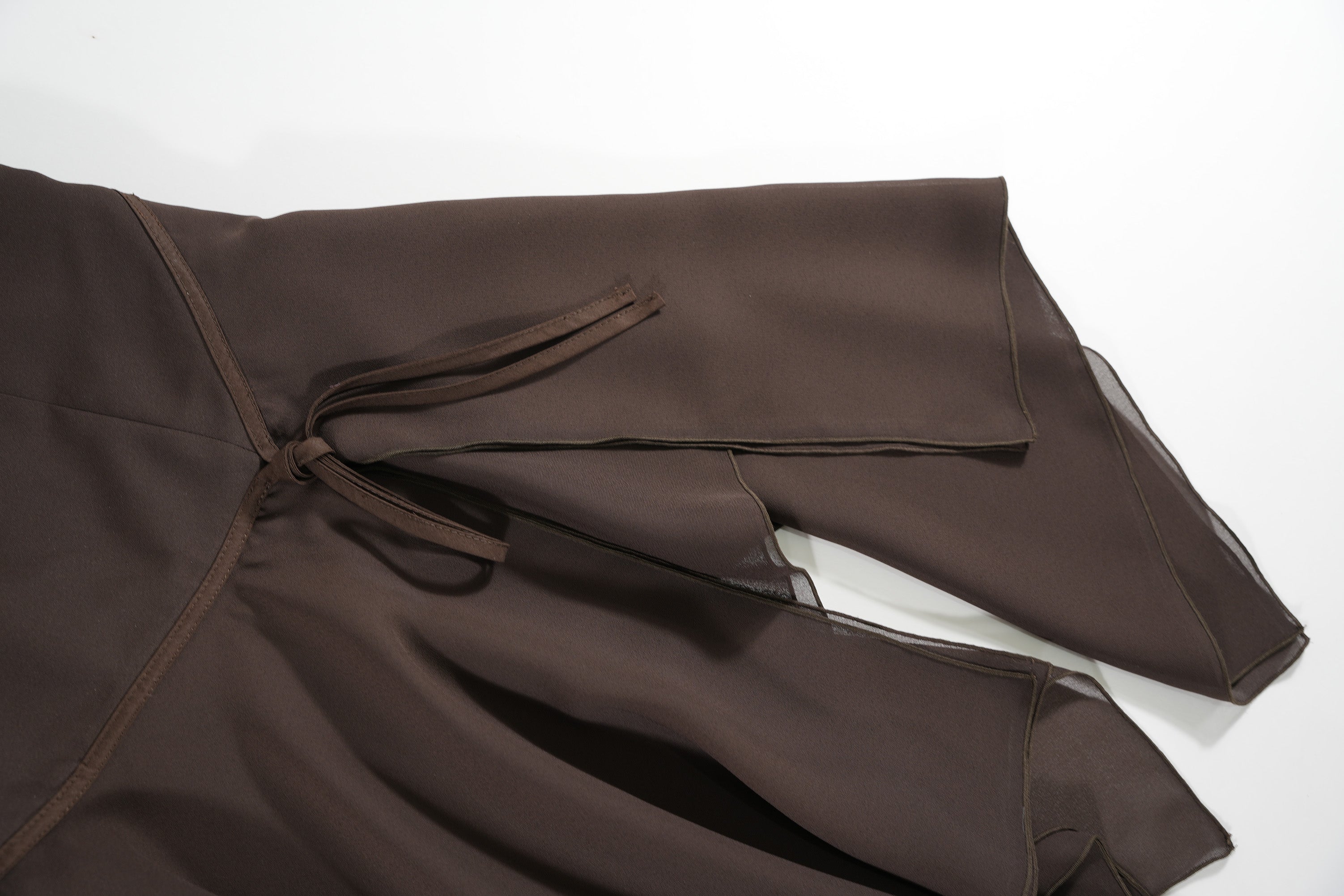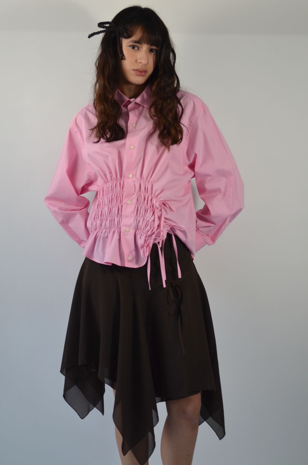 Falda asimétrica de gasa, semi transparente por la doble tela. Con cinta que hace corte en cadera y termina en moño. Abertura en pierna izquierda.