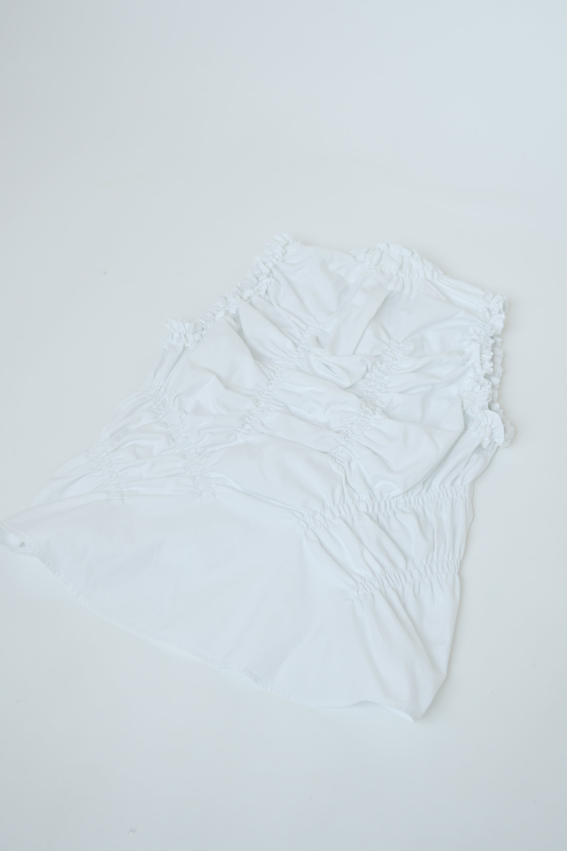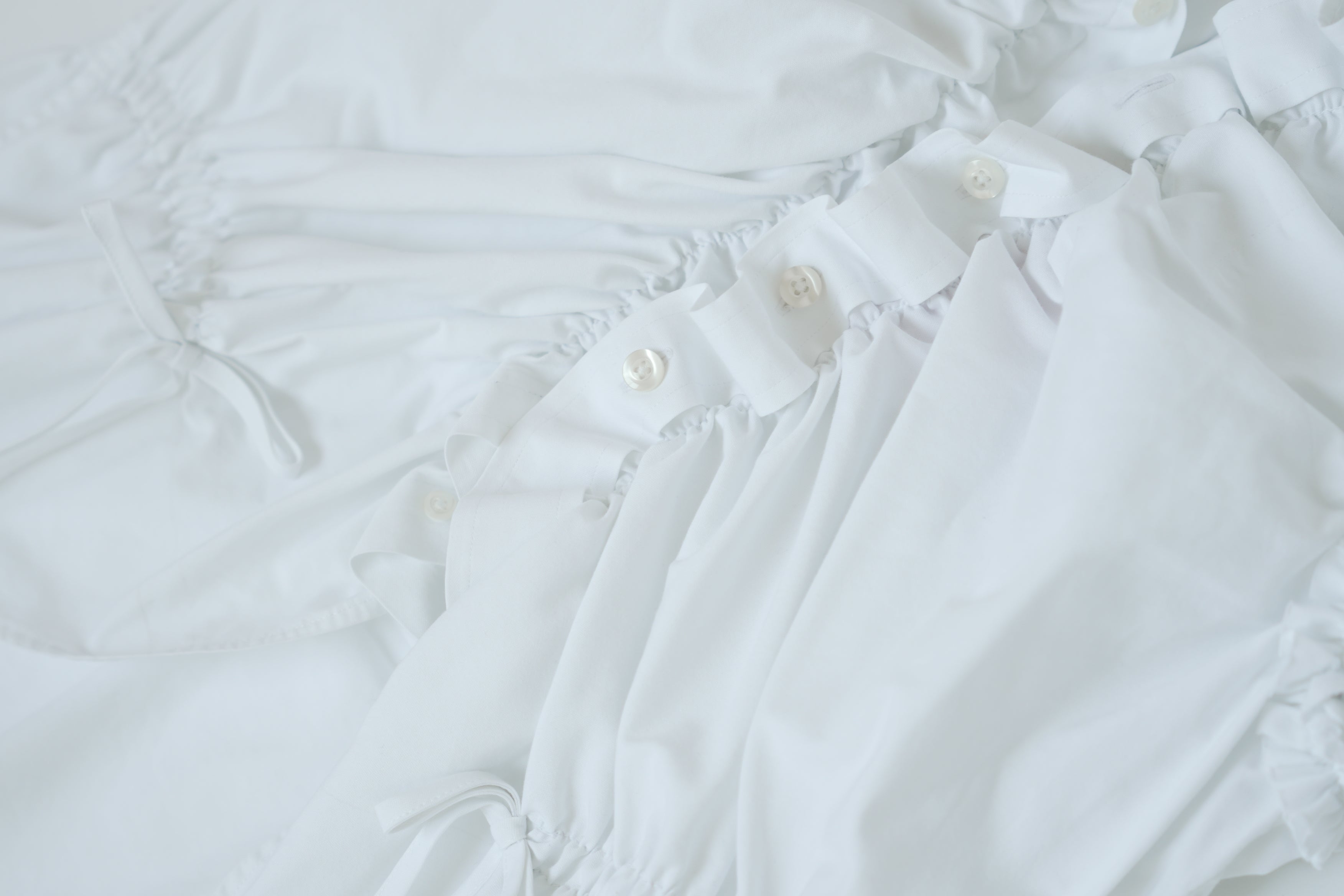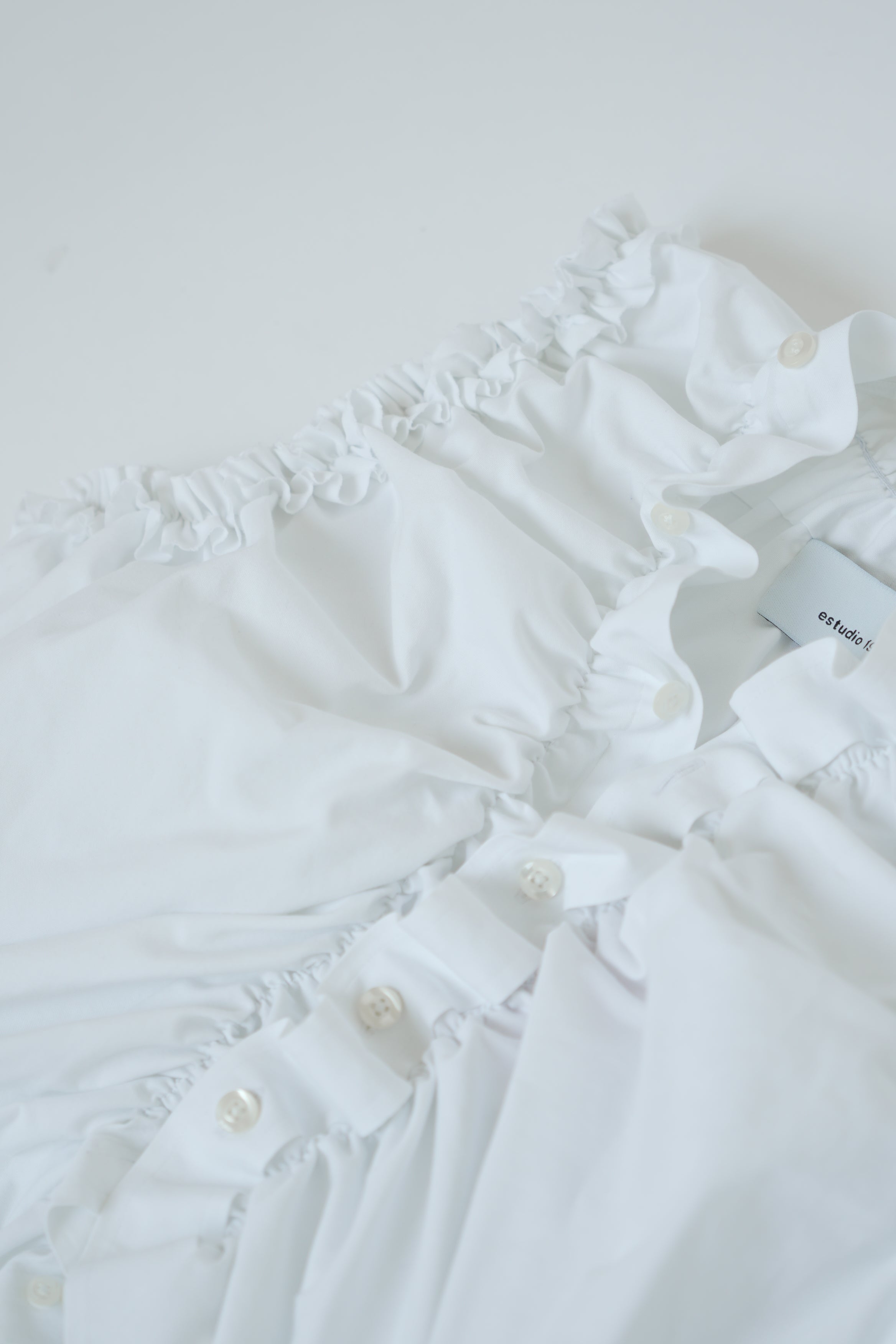 Camisa upcycled 1/1 con elásticos, moños y olanes.