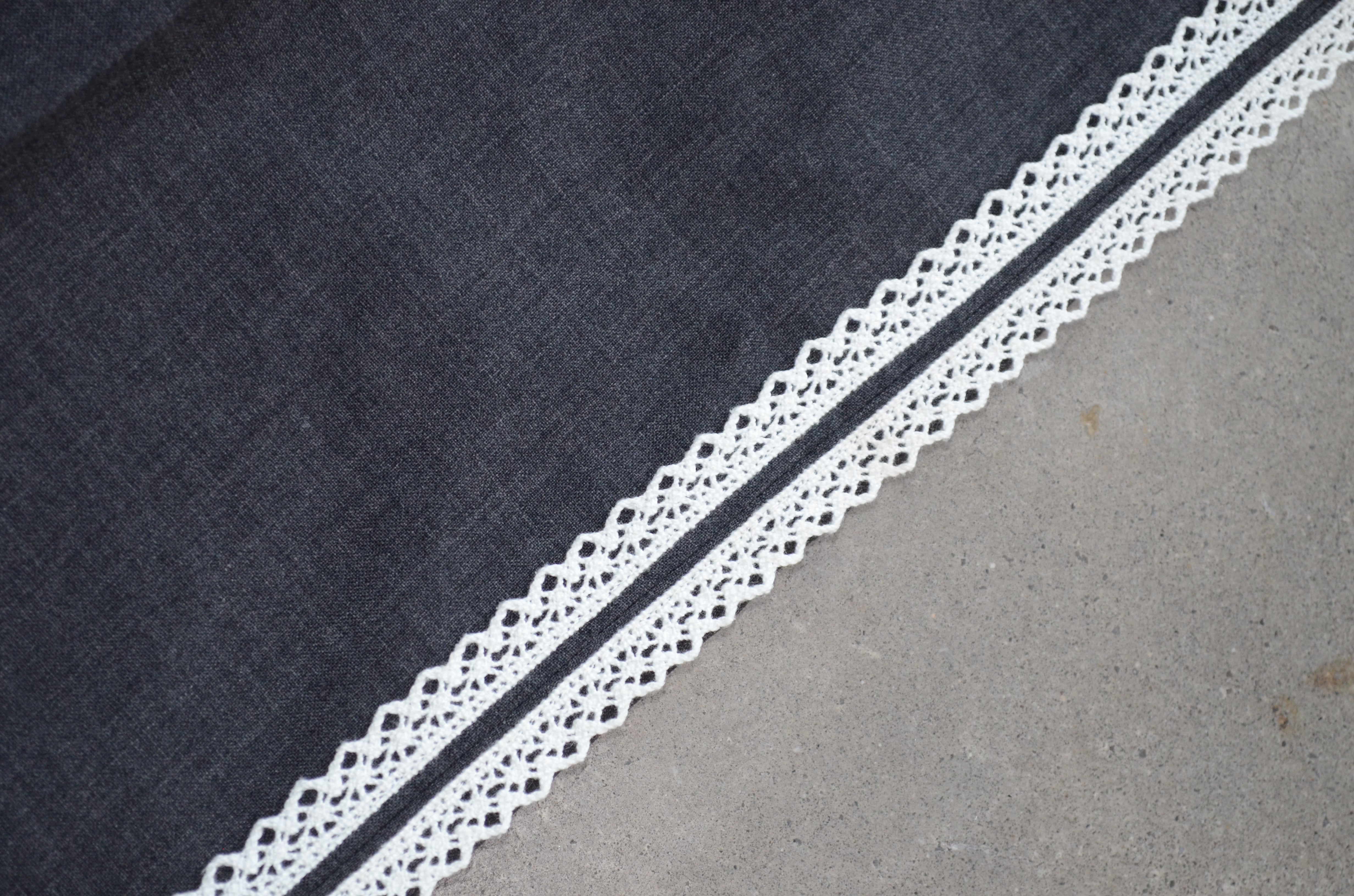Pantalón sastre upcycling con cintas de encaje decorativas. Originalmente de corte masculino, pero pensado para cualquier cuerpo.