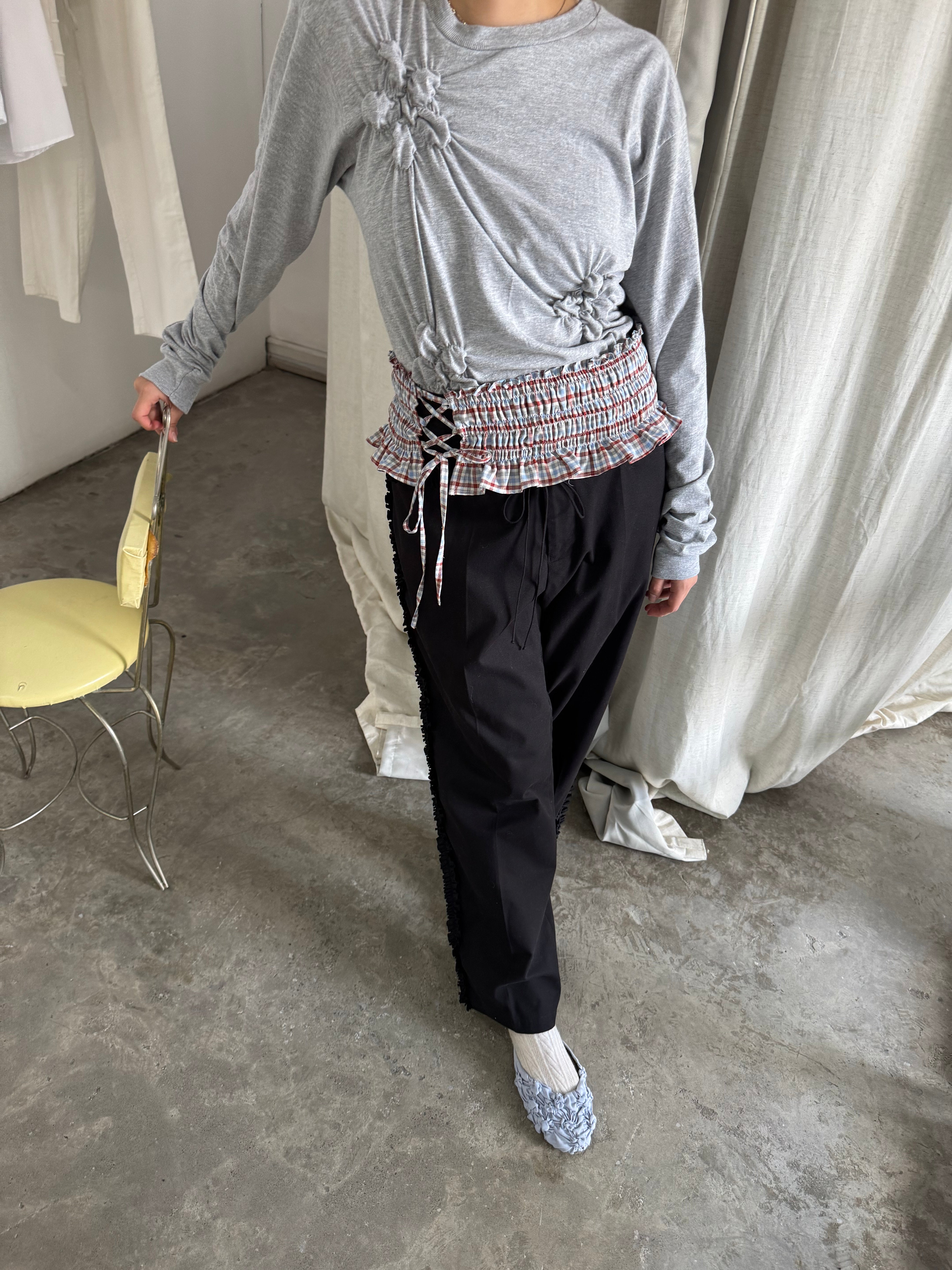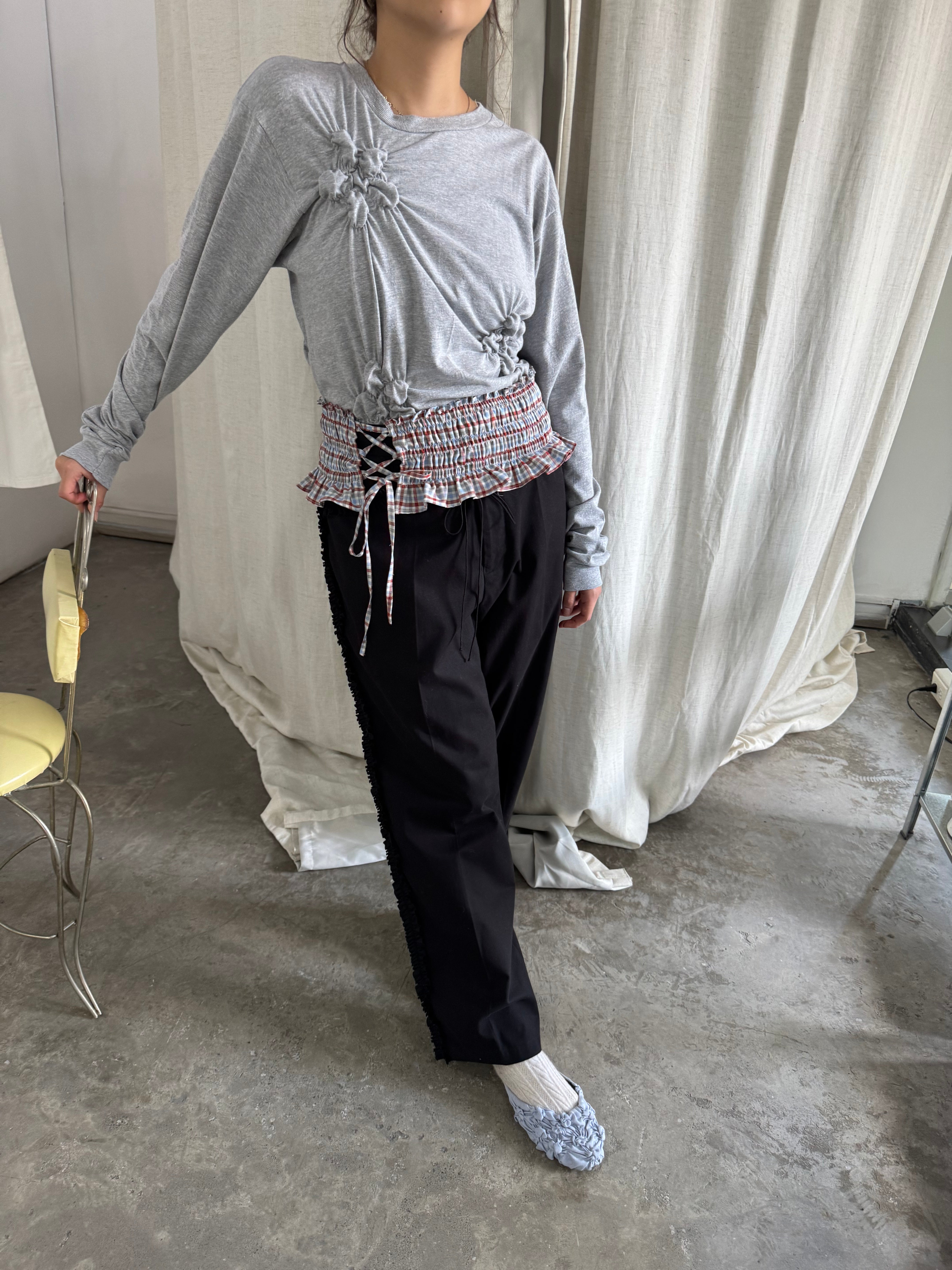 Cinturón 1/1, transformado a partir de camisas recuperadas. Su forma elástica y sus detalles fruncidos crean movimiento y un toque inesperado que le da un toque a cualquier outfit.