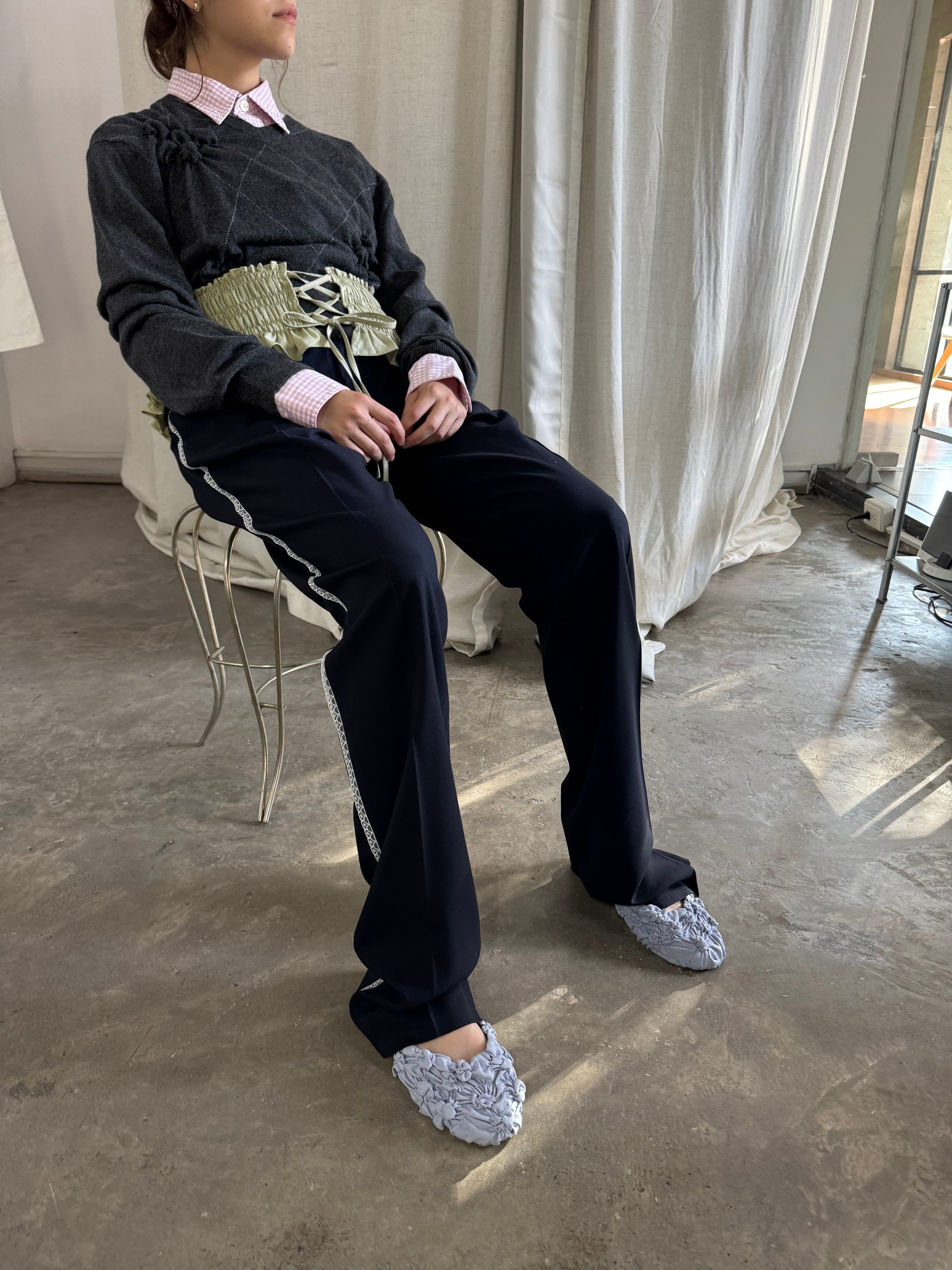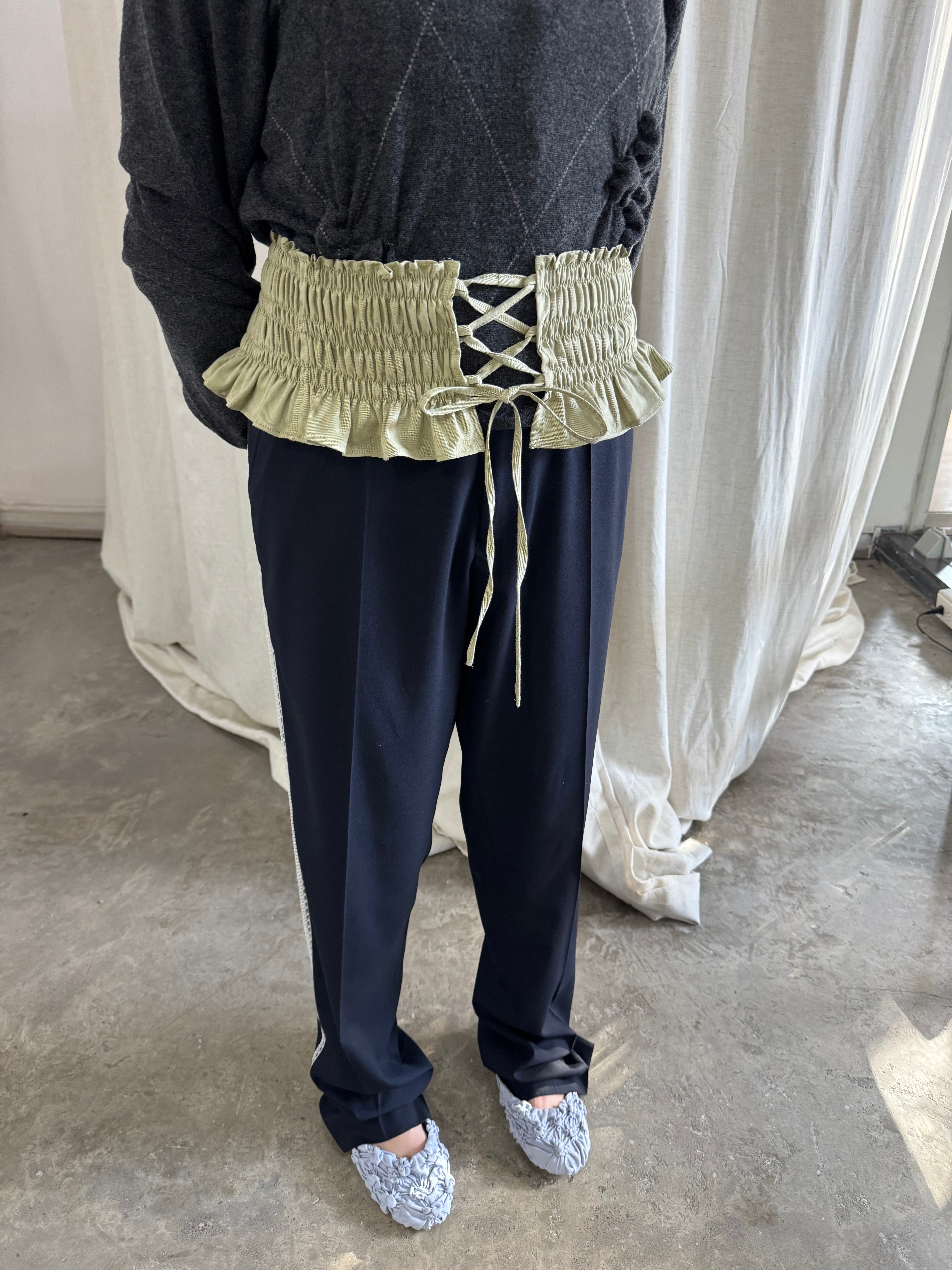 Cinturón 1/1, transformado a partir de camisas recuperadas. Su forma elástica y sus detalles fruncidos crean movimiento y un toque inesperado que le da un toque a cualquier outfit.