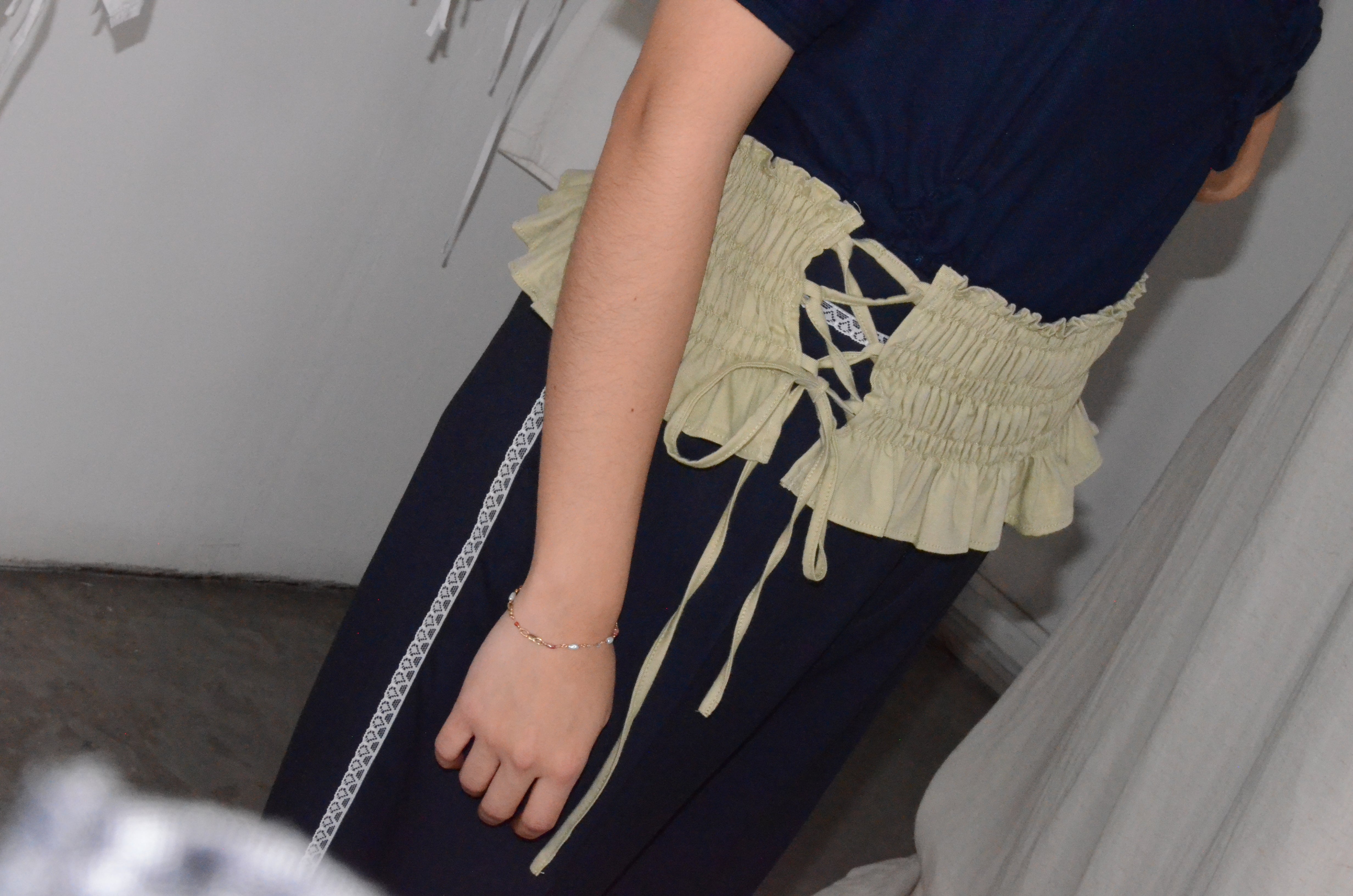 Cinturón 1/1, transformado a partir de camisas recuperadas. Su forma elástica y sus detalles fruncidos crean movimiento y un toque inesperado que le da un toque a cualquier outfit.