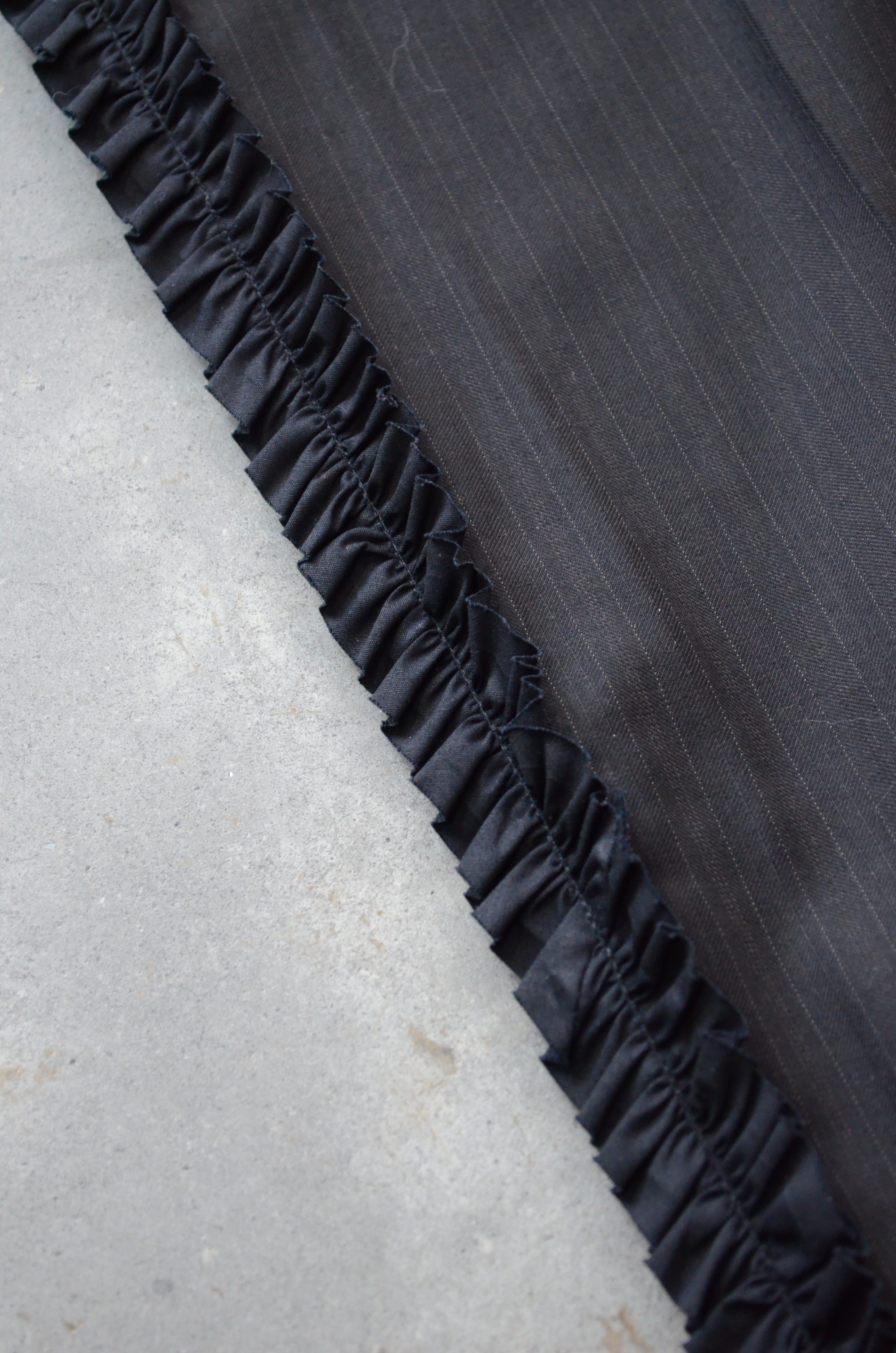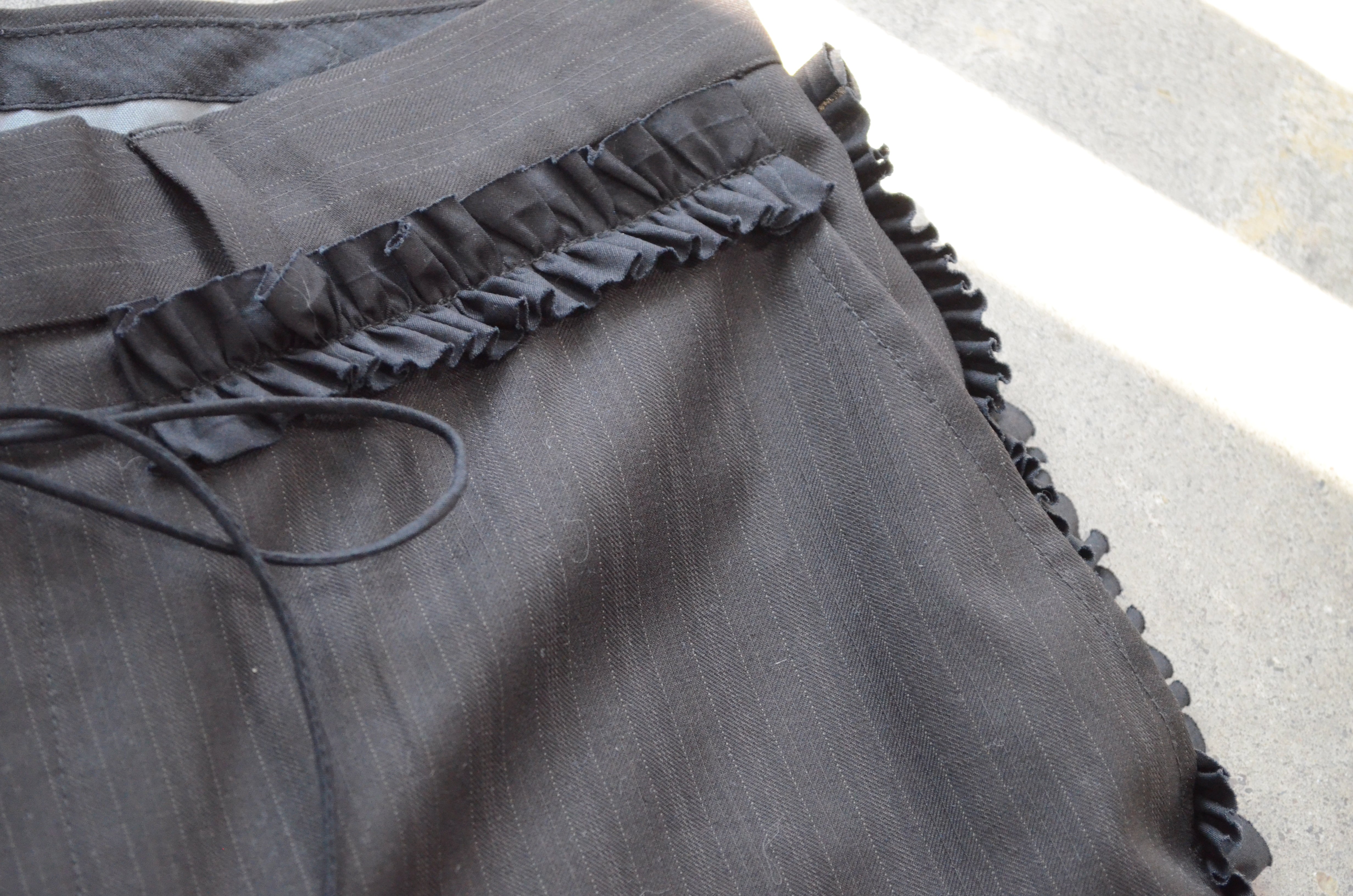 Pantalón sastre upcycling con fruncidos y cintas decorativas. Originalmente de corte masculino, pero pensado para cualquier cuerpo.