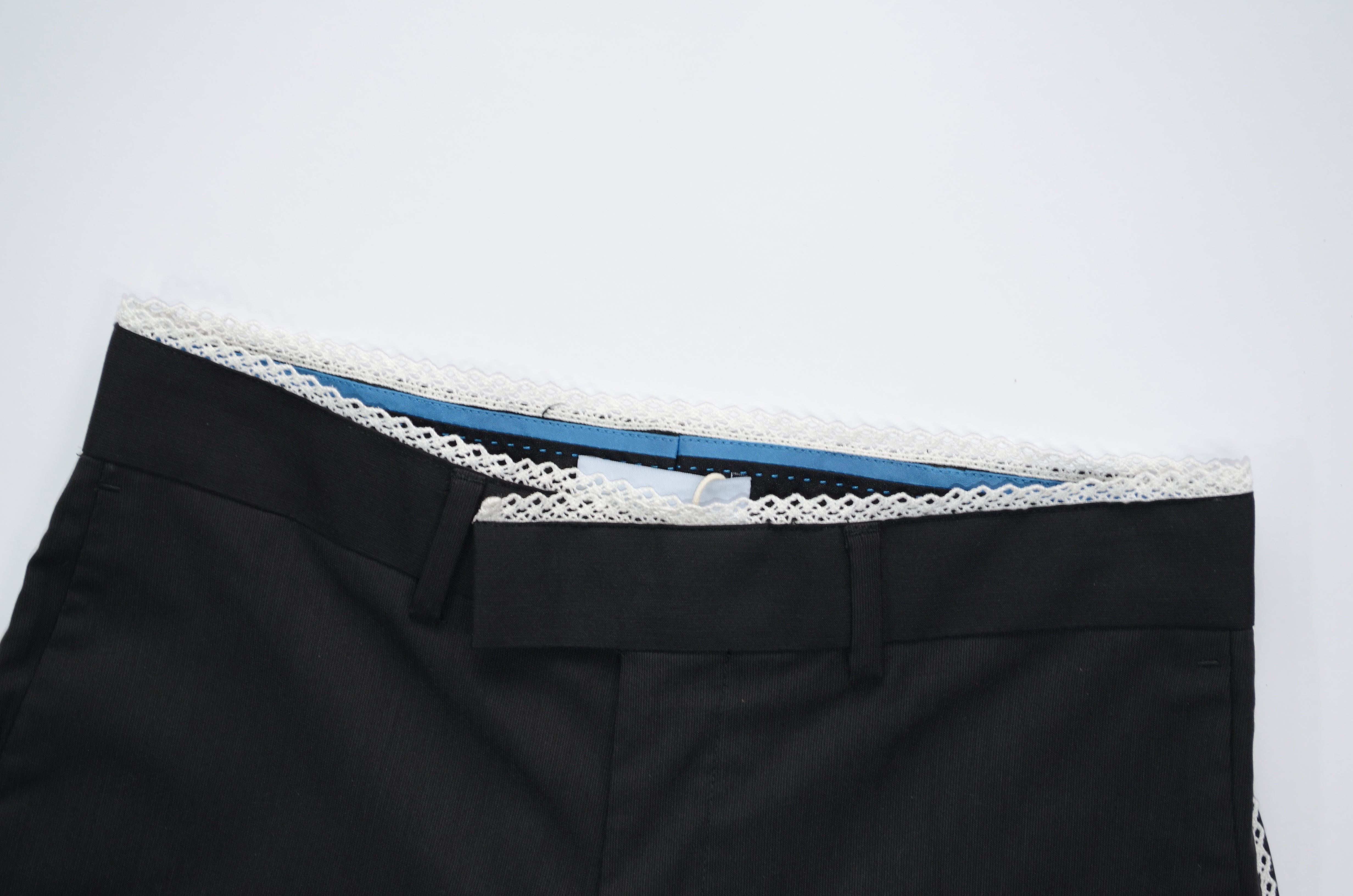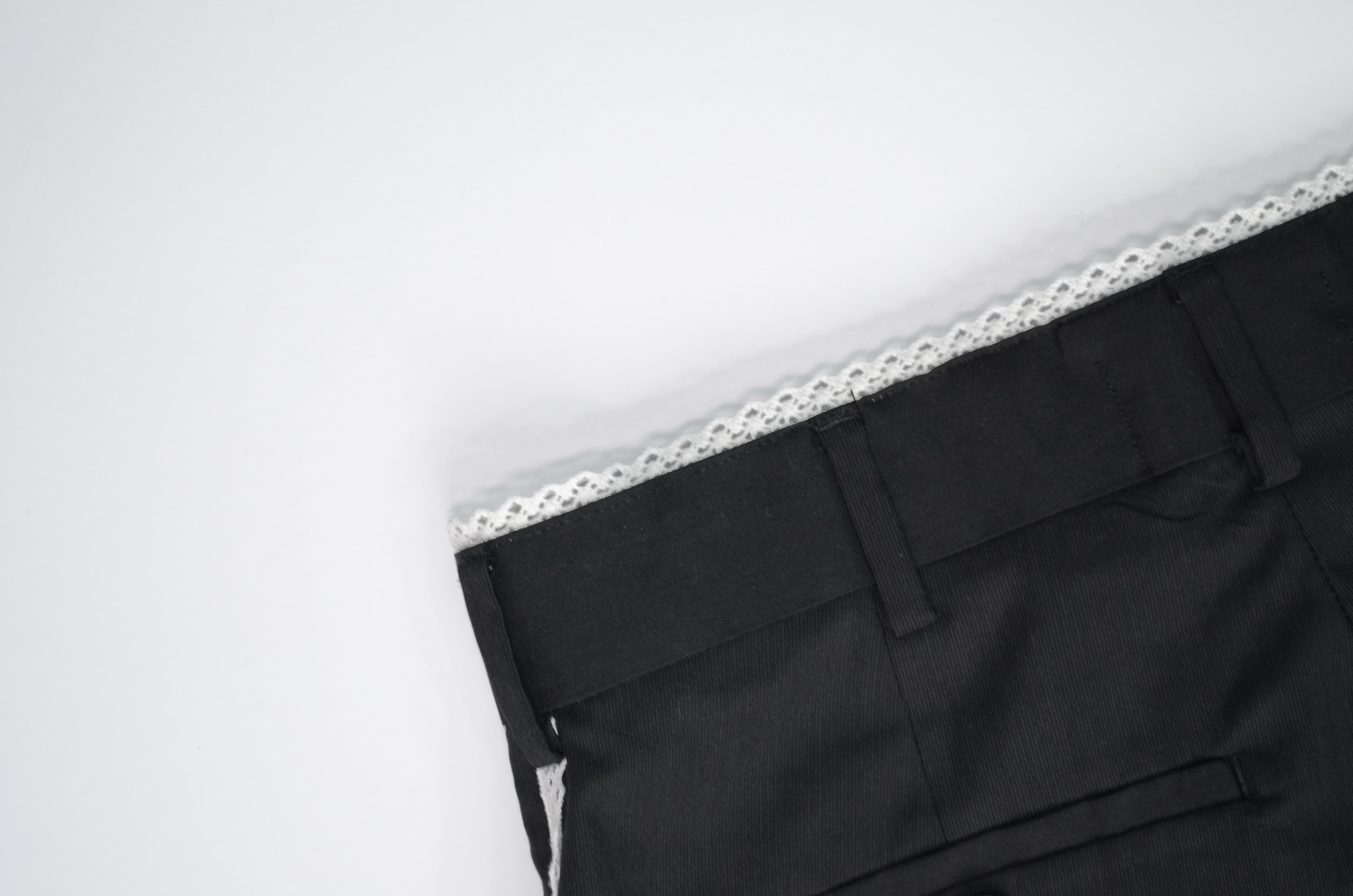 Pantalón sastre upcycling con cintas de encaje decorativas.