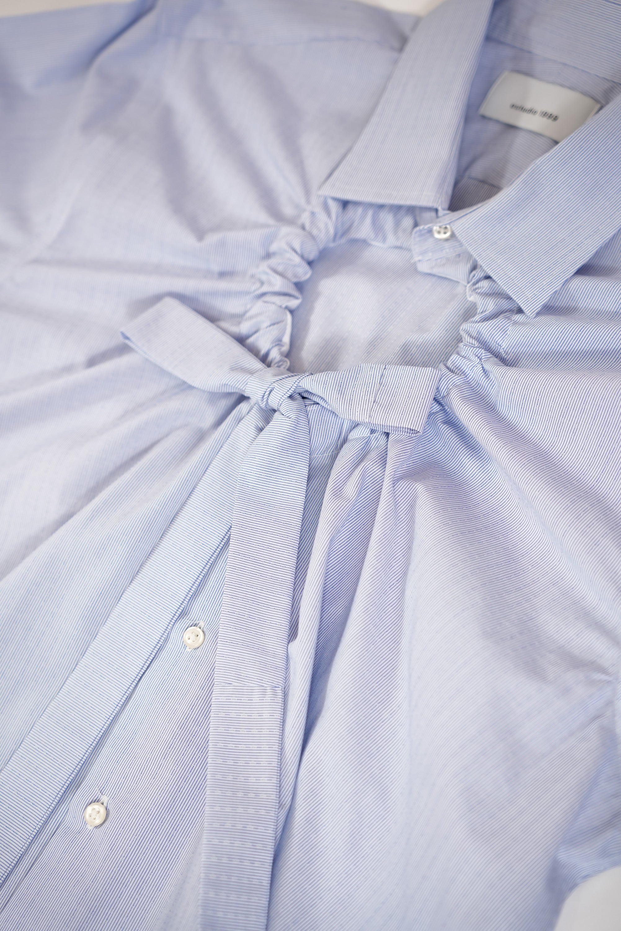 Confeccionada en algodón, su diseño forma una ventana en el pecho. El escote es ajustable con una cinta para hacer moño. Cada pieza es irrepetible, con una personalidad propia en sus detalles y en la tela.